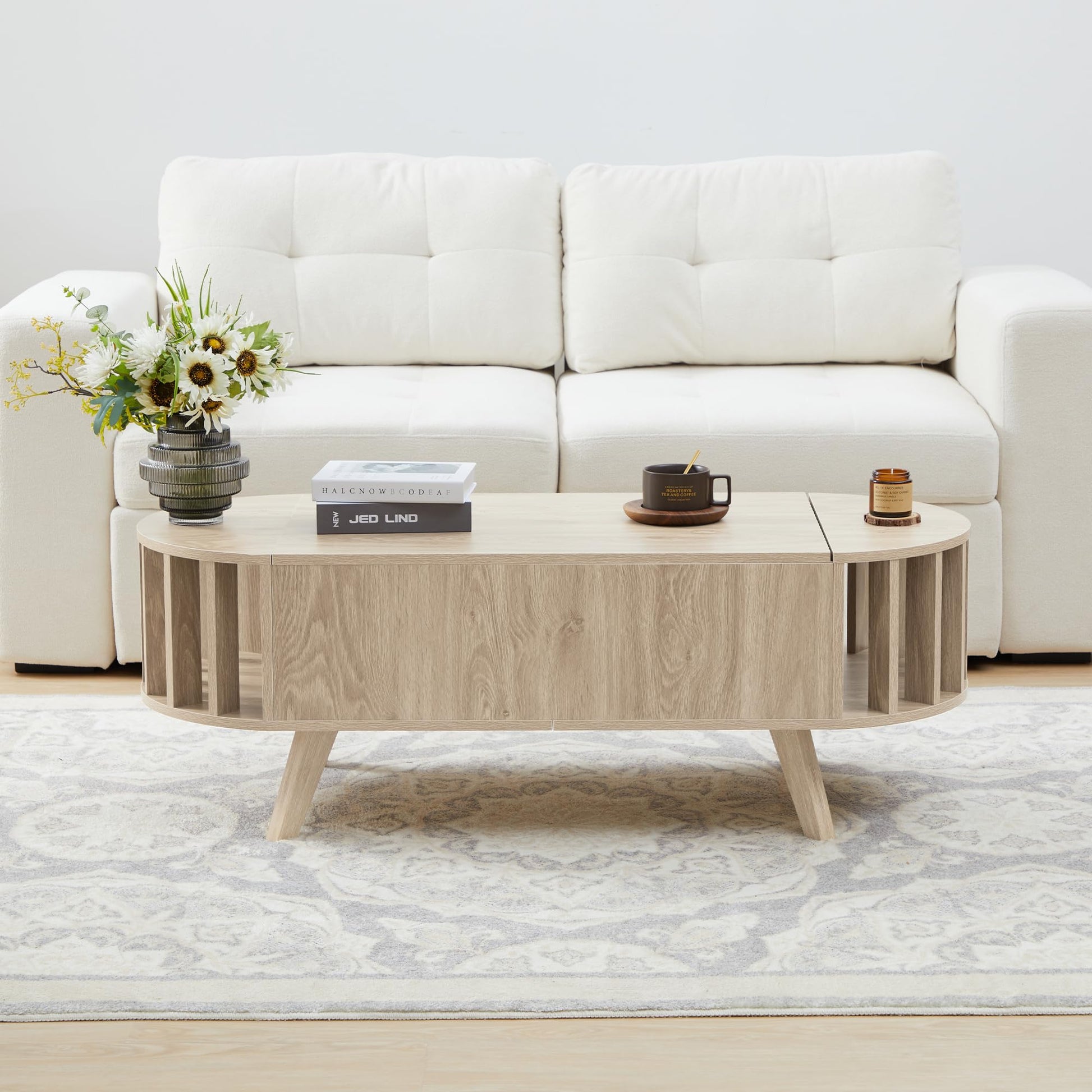 - We offer a ceiling-top coffee table that combines modern aesthetics with practical functionality. Crafted with a liftable midtop and unique oval curved edges and rotating panel fencing, the semi-open compartments not only enhance functionality but also add a touch of sophistication to any room. Smooth oval curved edges and a sturdy metal lifting mechanism ensure style and durability.