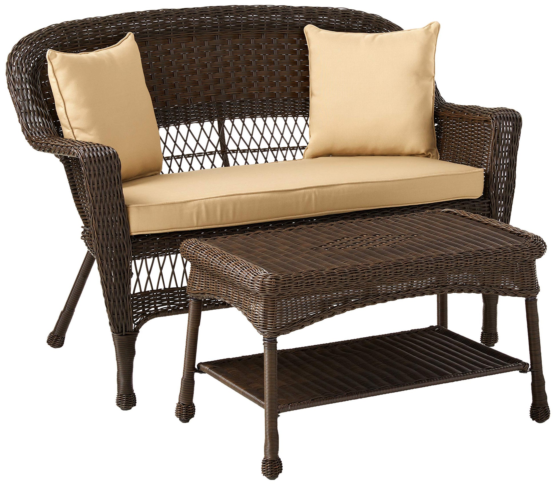 Wicker Patio Love Seat and Coffee Table Set with Tan Cushion, Espresso
