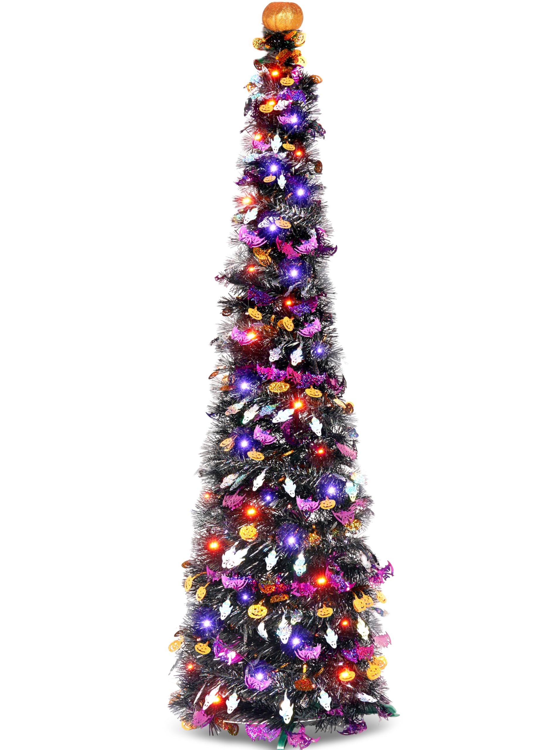 - Package Includes. Our Halloween light up tree is designed with black tinsel, purple spider, and spider web sequins around. Comes with a battery-operated 50 LEDs orange and purple lights. Shiny and sparkling adding a scary and spooky atmosphere for Halloween. Product size 5 x 1.2 x 1.2 feet. Battery not included.