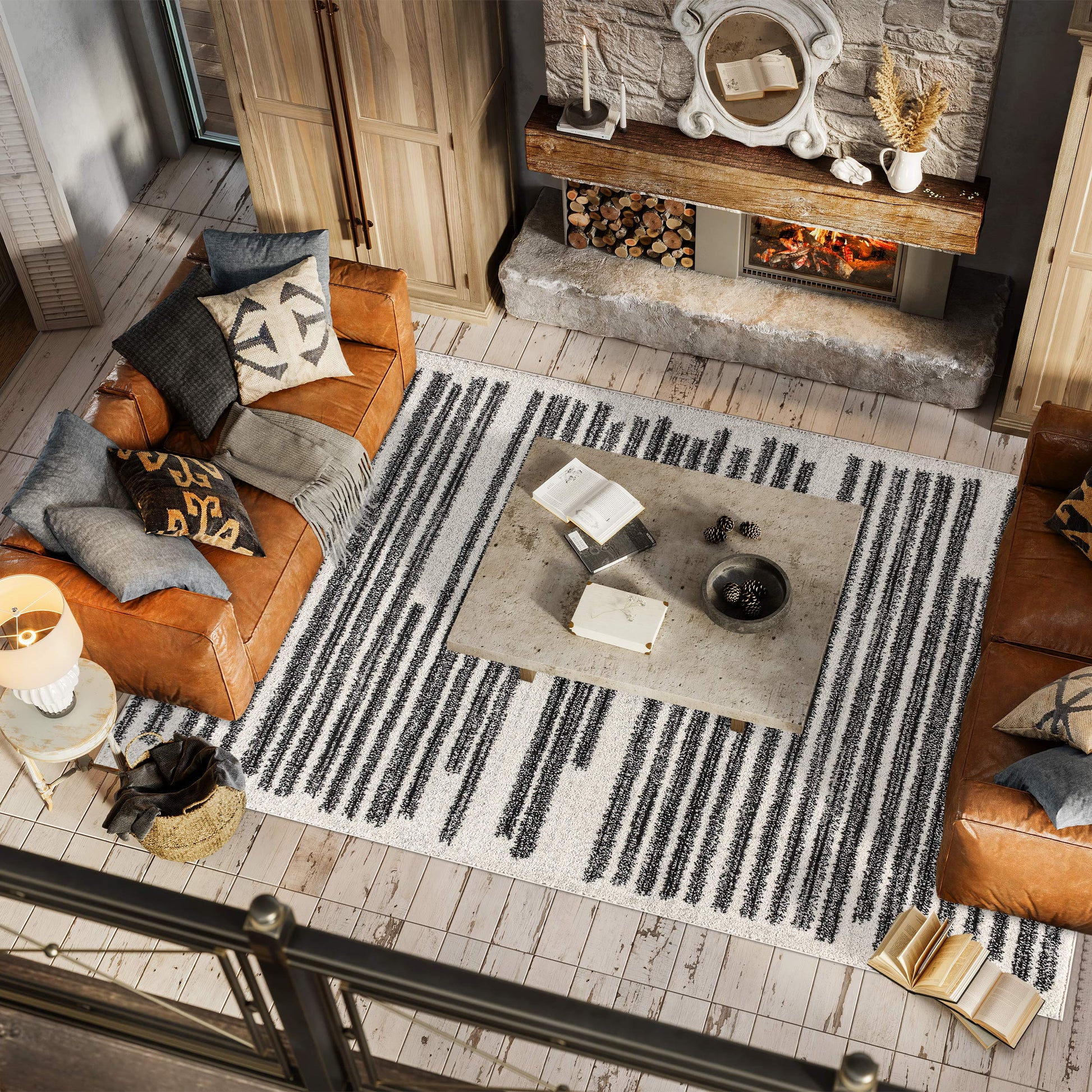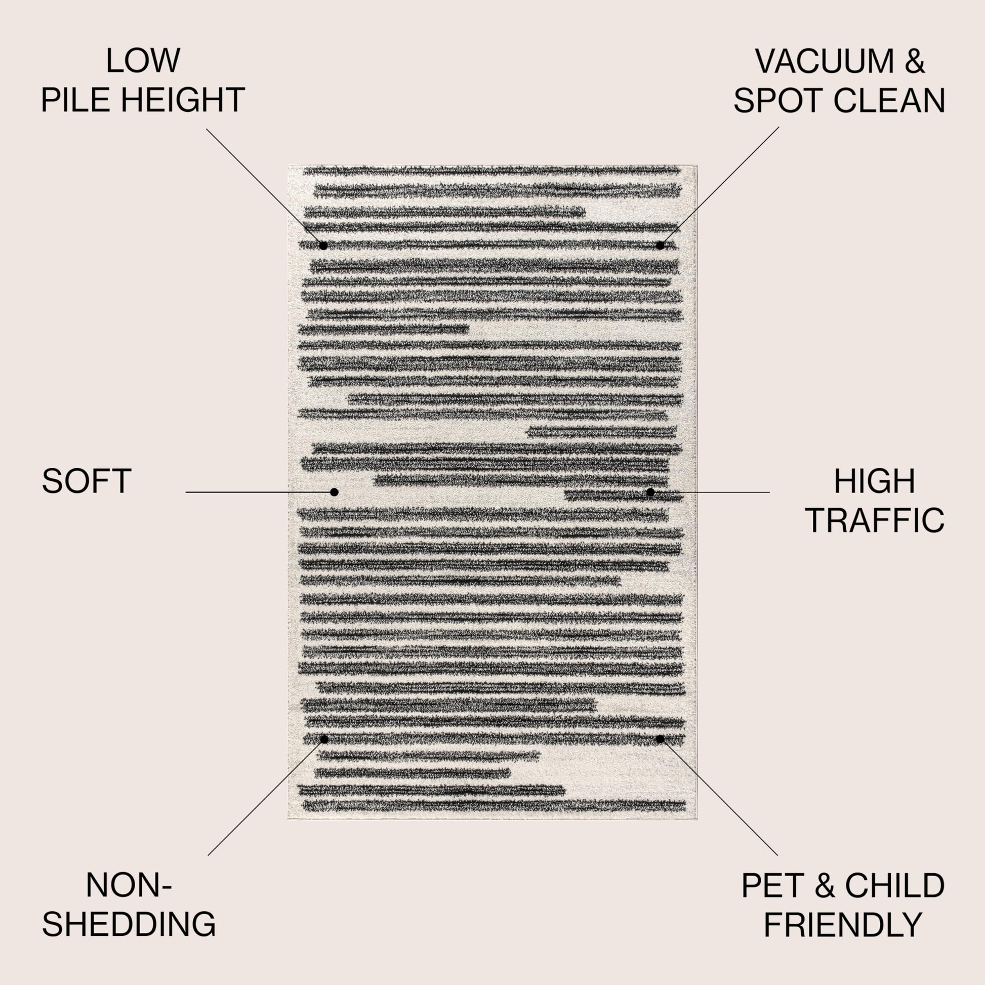 Details: Inspired by vintage Moroccan rugs, Our modern striped rug is power-loomed with a short pile. The offset stripe and bar pattern is woven in black on an ivory background; The mingled threads recall traditional handwoven rugs. Add some mid-century style to your home with this easy-care rug.
