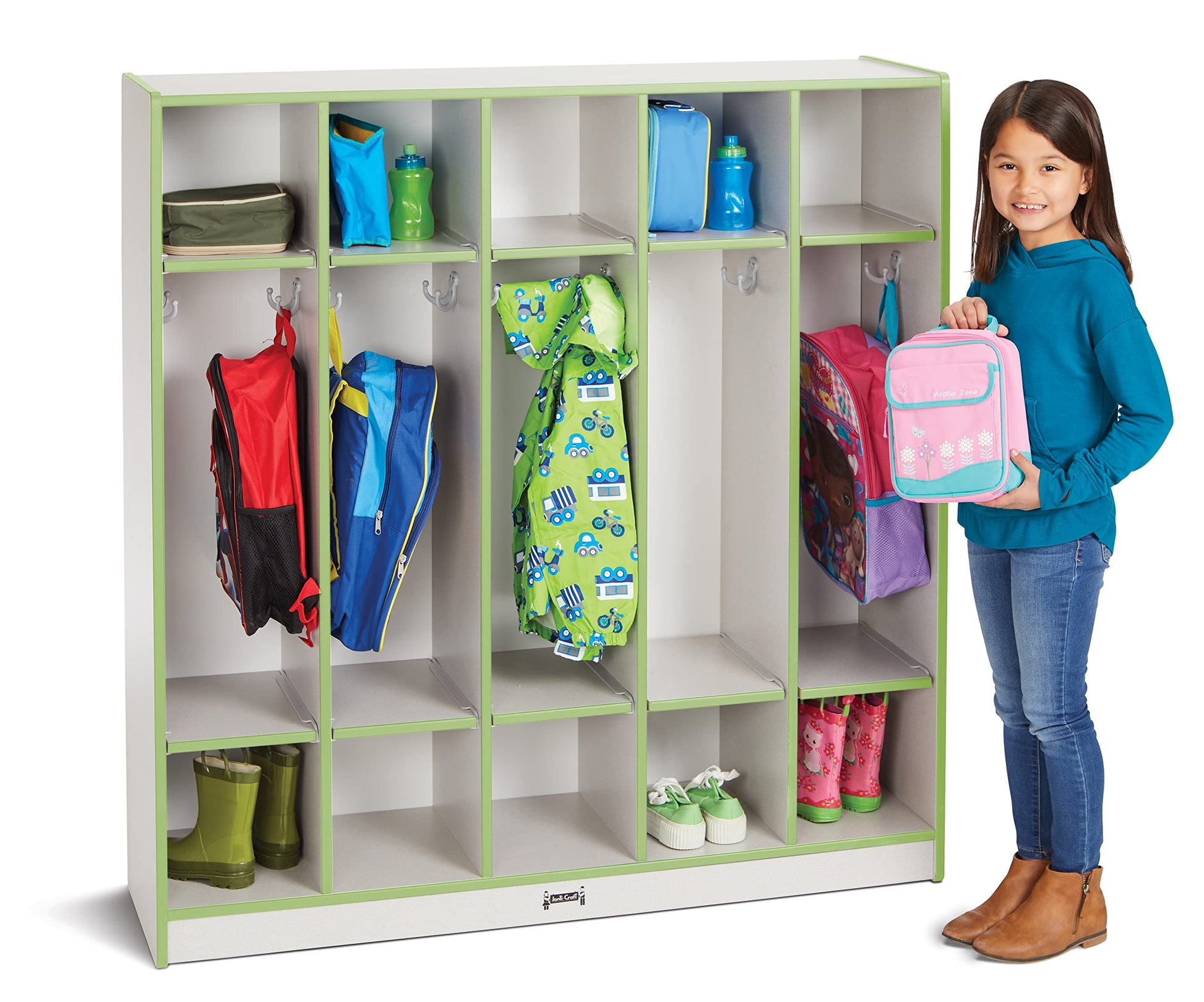 - LARGE STORAGE CAPACITY - Our key lime green trim coat locker features 5 sections. Each section has 2 double coat hooks, an overhead shelf, and a lower shelf. It's perfect for storing coats, jackets, backpacks, shoes, boots, lunchboxes, and more.