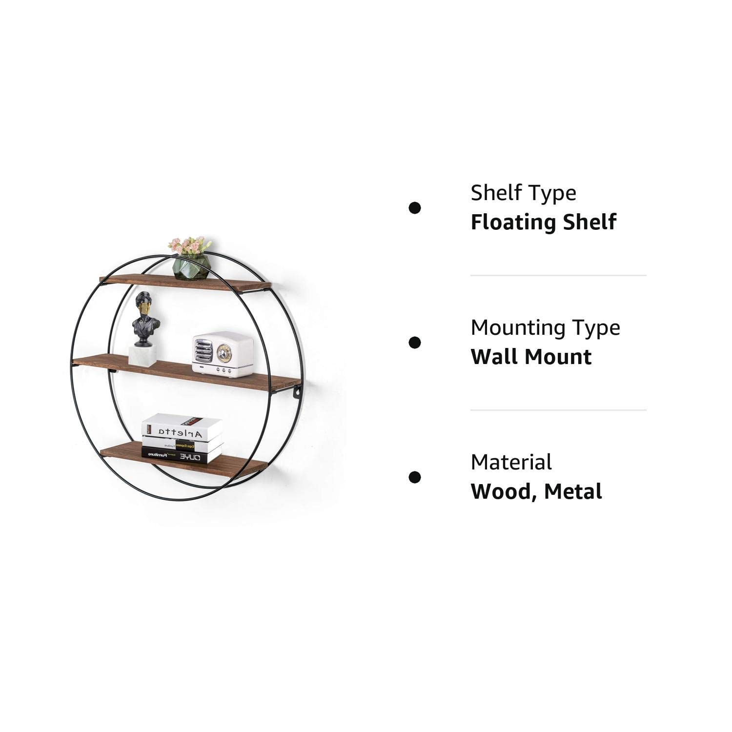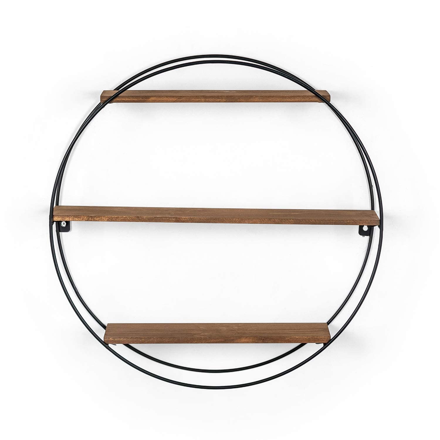 - FUNCTIONAL WALL SHELF: This decorative shelf is versatile, functional, and will be a beautiful accent in any room of your home. This piece showcases an eye-catching round shape with a metal accent. 3 wood shelves give it storage space for your knickknacks.