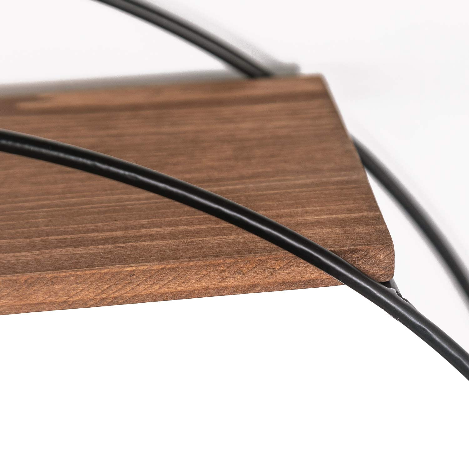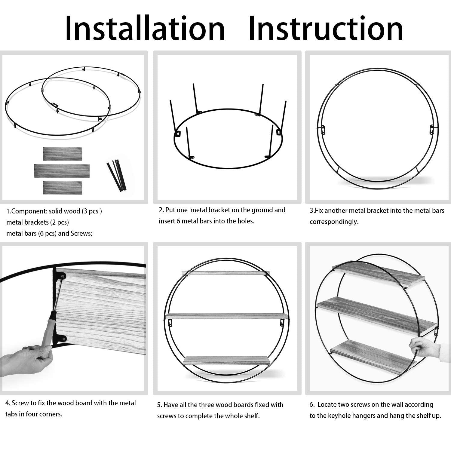- ROUND WOOD WALL SHELVES: Traditional, modern design meets functionality with the artistic look of this wall shelf. Constructed of a black metal frame with 3 staggered solid wood shelves, it can be used to display your books, photo frames, or decorations in your living room or home office.