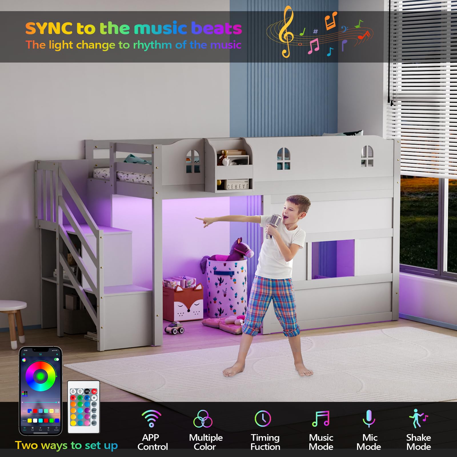 - Multi-function RGB Led Loft Bed: With smart LED light strips underbed that can be effortlessly controlled via an app, remote, it offers more than over 10,000 colors, 20+ preset light effects (brightness, flash, wave), and multiple modes (music, mic, time mode, etc.) to freely create your bedroom atmosphere to suit your mood and style. Whether you prefer gentle, warm lighting for reading/sleeping or vibrant colors for a party atmosphere, this led bed has it all