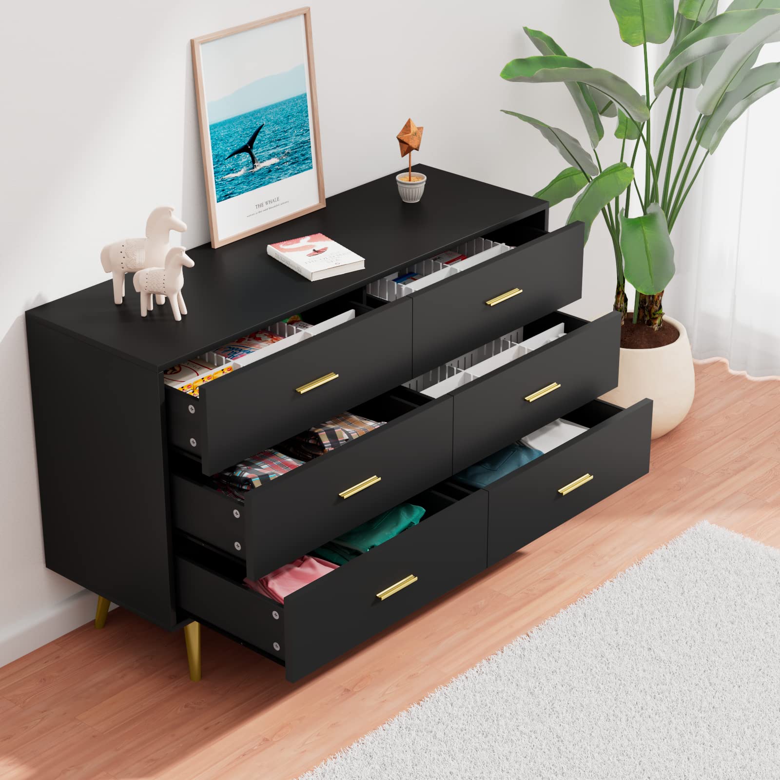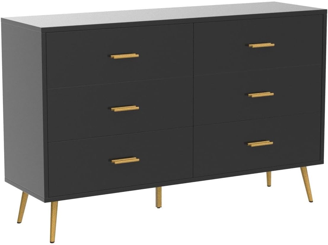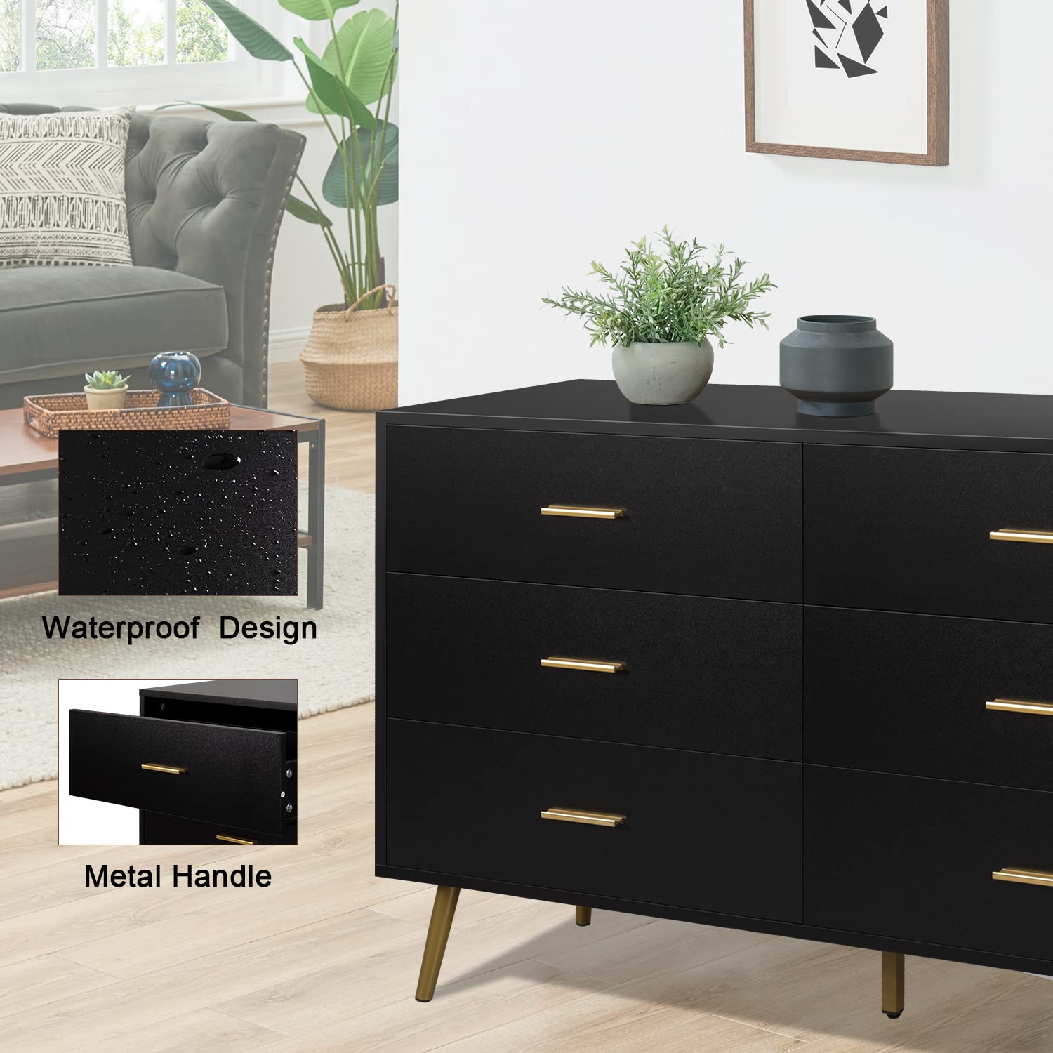 Dresser for Bedroom with 6 Drawers, Wooden Black Dresser with Golden Handles, Modern Chests of Drawer Storage Organizer for Hallway, Entryway
