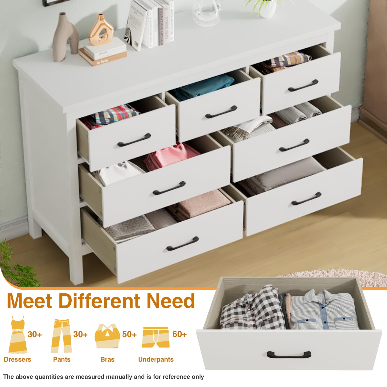 - JOZZBY white dresser measures 47.2"W x 15.7"D x 31.7"H. The oversized top of this chest of drawers is the perfect place to display decor, photos, plants, and more. It also has 3 medium drawers and 4 large drawers to store and sort clothes, books, toys, and other household items. This large storage capacity dresser covers all your storage needs to keep your room neat and organized.