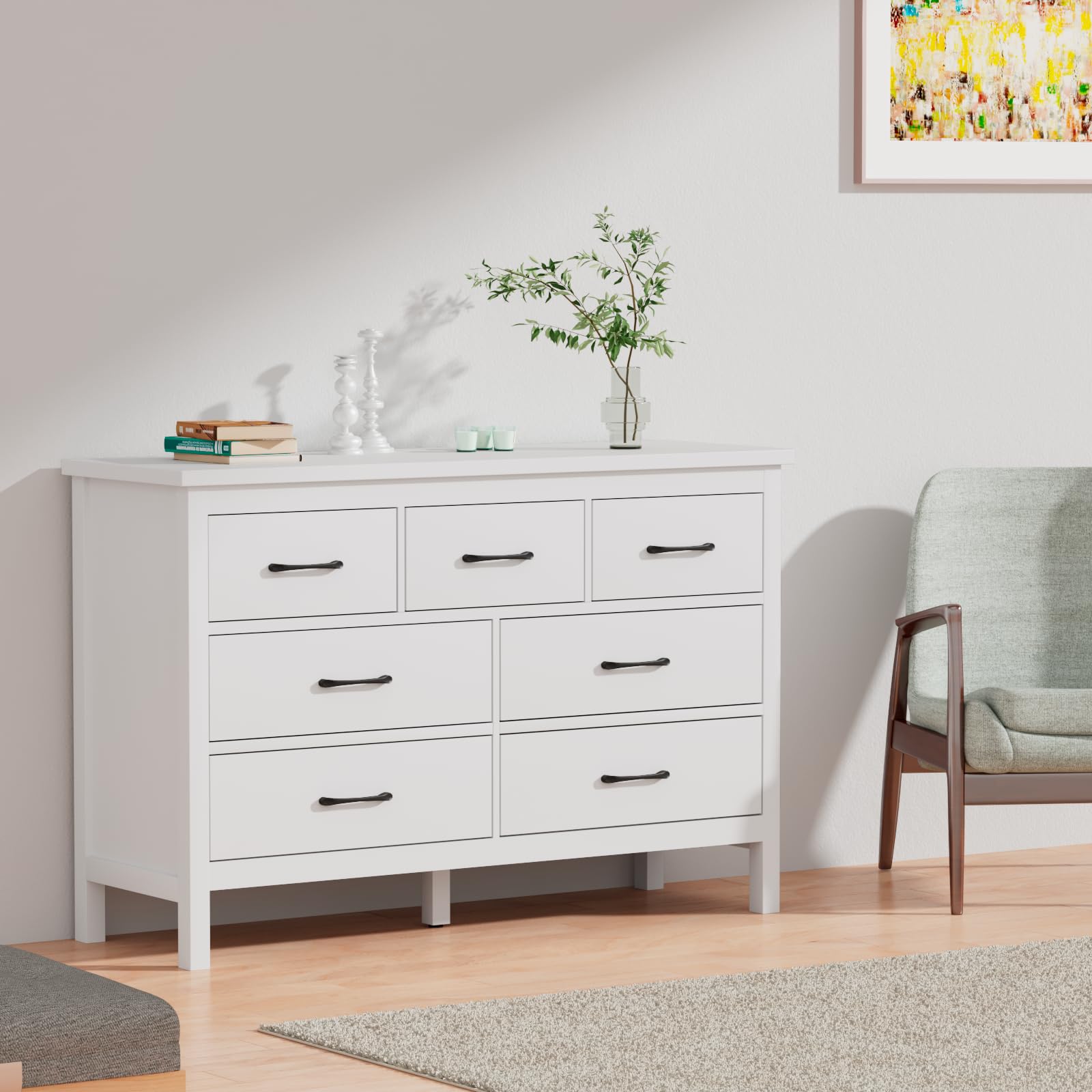 Dresser for Bedroom with 7 Drawers, Modern White Dresser with Golden Handles