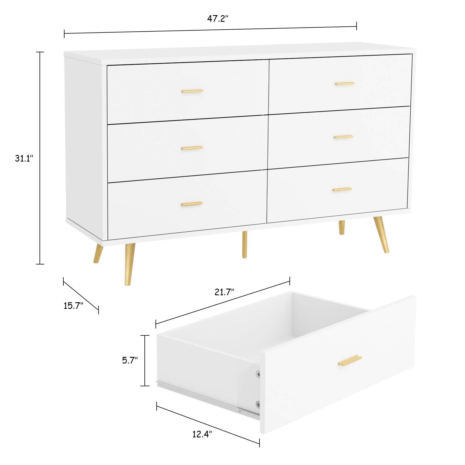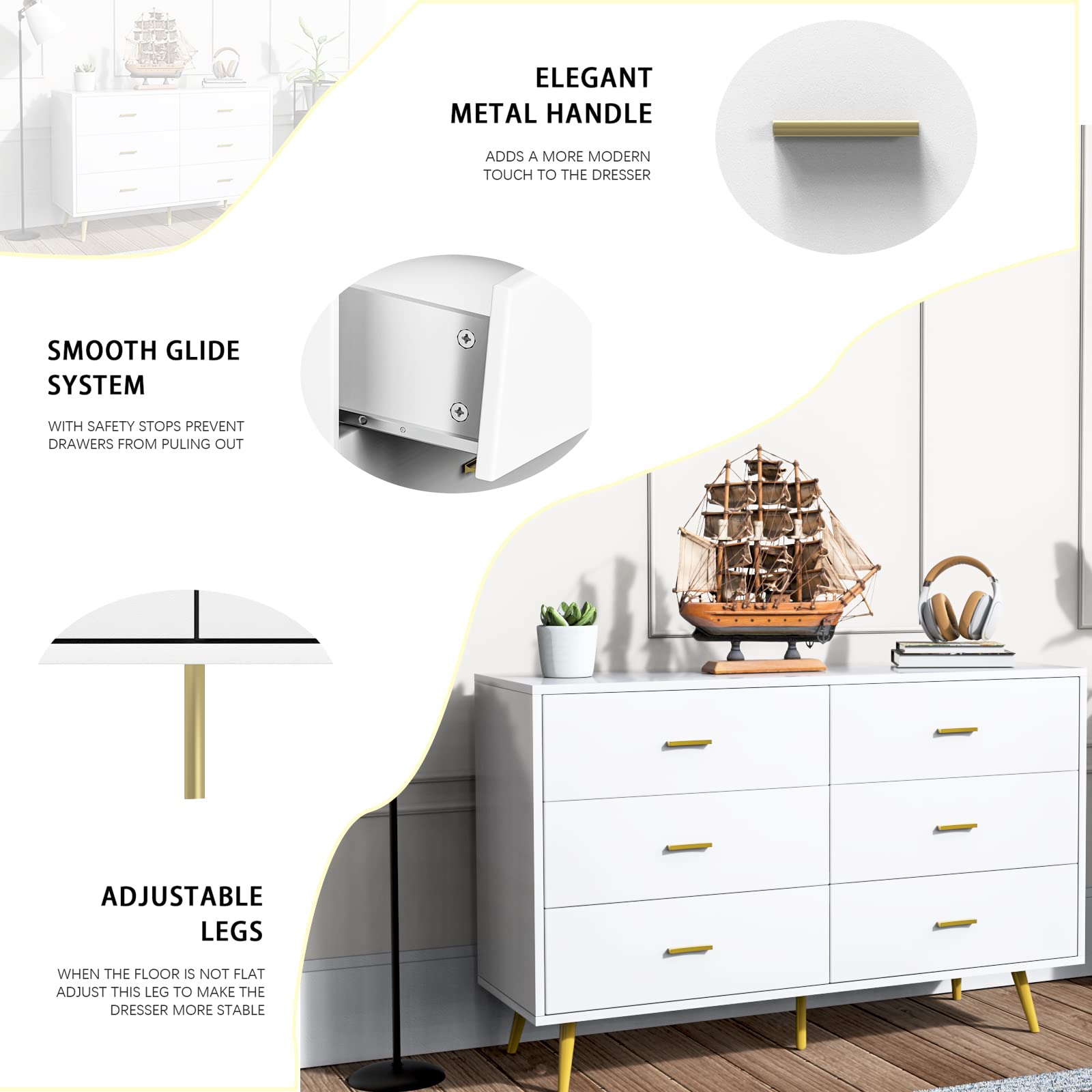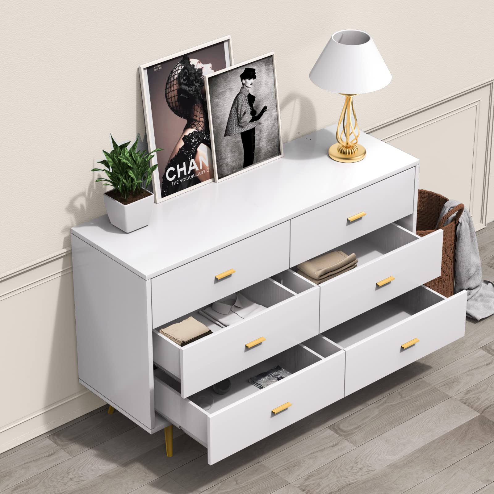 White Dresser, 6 Drawer Dresser for Bedroom with Wide Drawers and Metal Handles