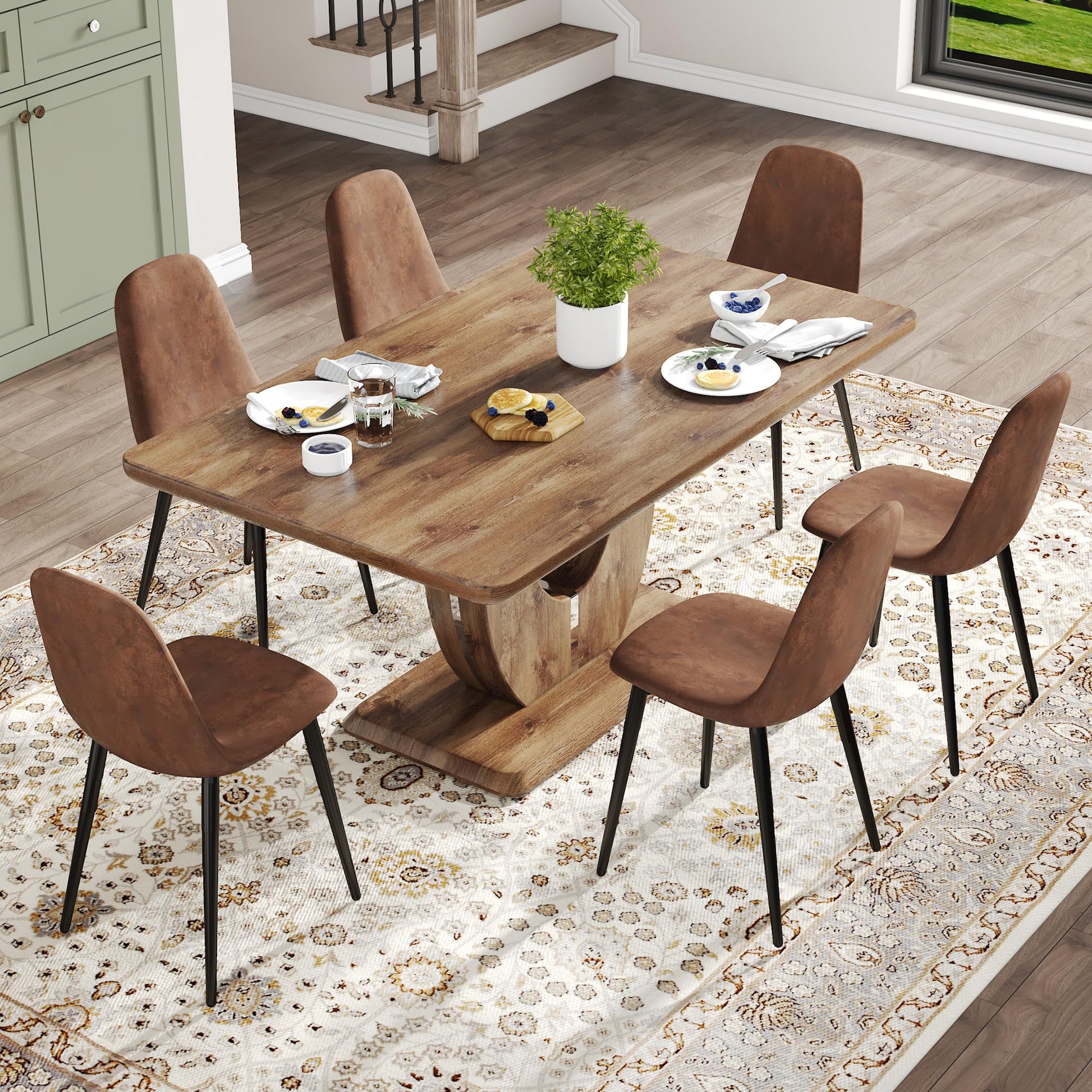 - Kitchen Table Chairs Set for 6 can enhance your dining experience. With its modern and minimalist design, it showcases a clear faux wood tabletop and a U-shapedtextured base, giving an upscale and sophisticated appearance. It is the perfect addition to any dining area. Combine it with upholstered dining chairs to create a stylish and cozy dining environment.