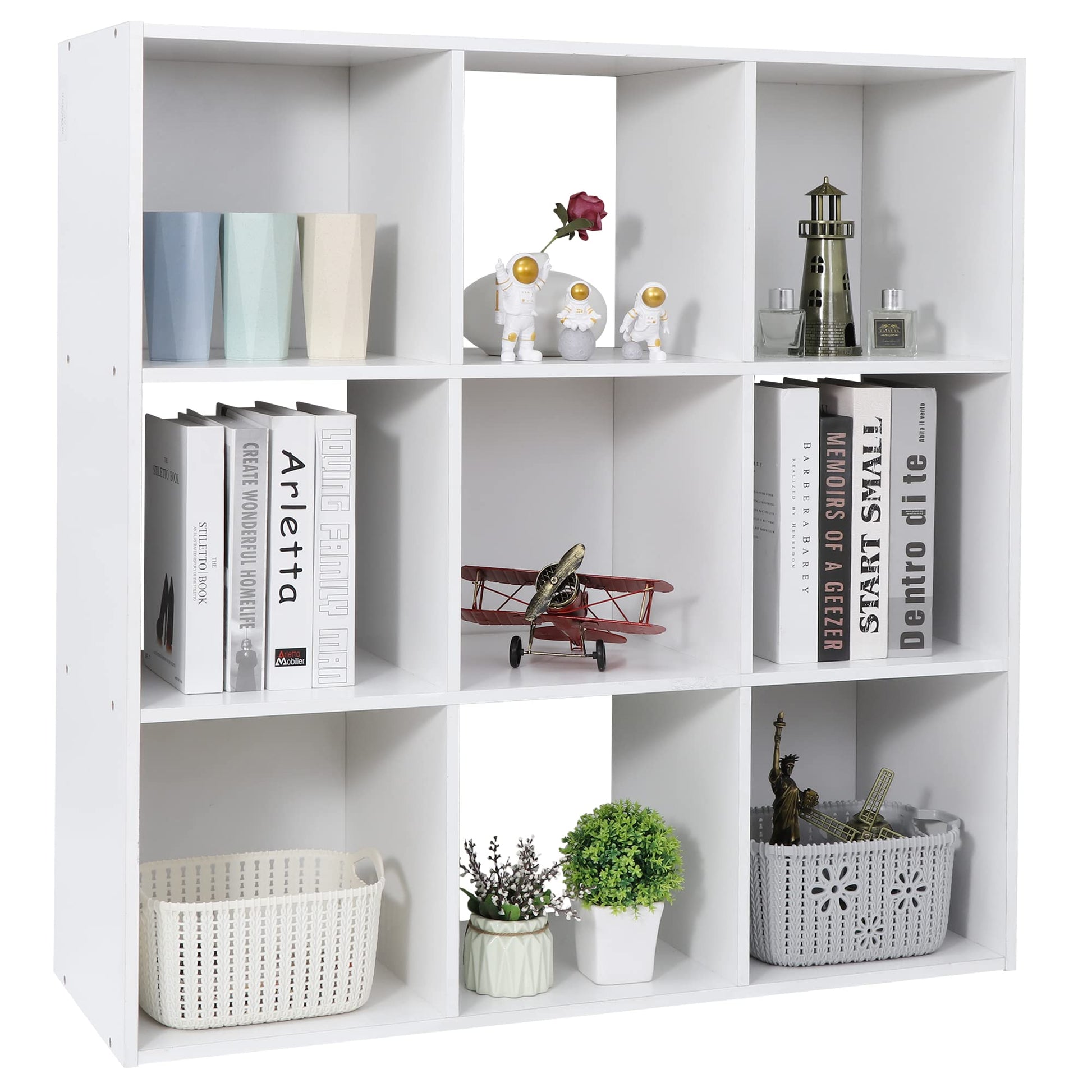 9 Cube Storage Organizer Wooden Display Shelf W/ 5 Removable Back Panels, Customizable Bookcase Bookshelf for Home, Office, Bedroom and Living Room (White)