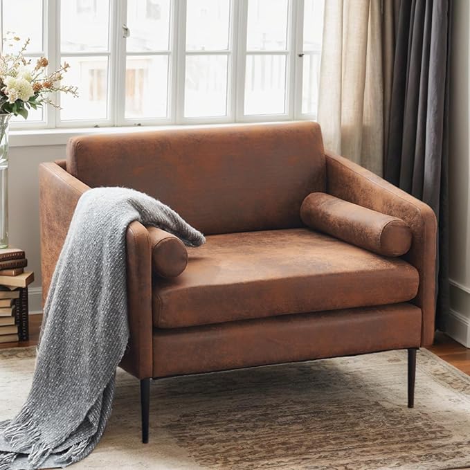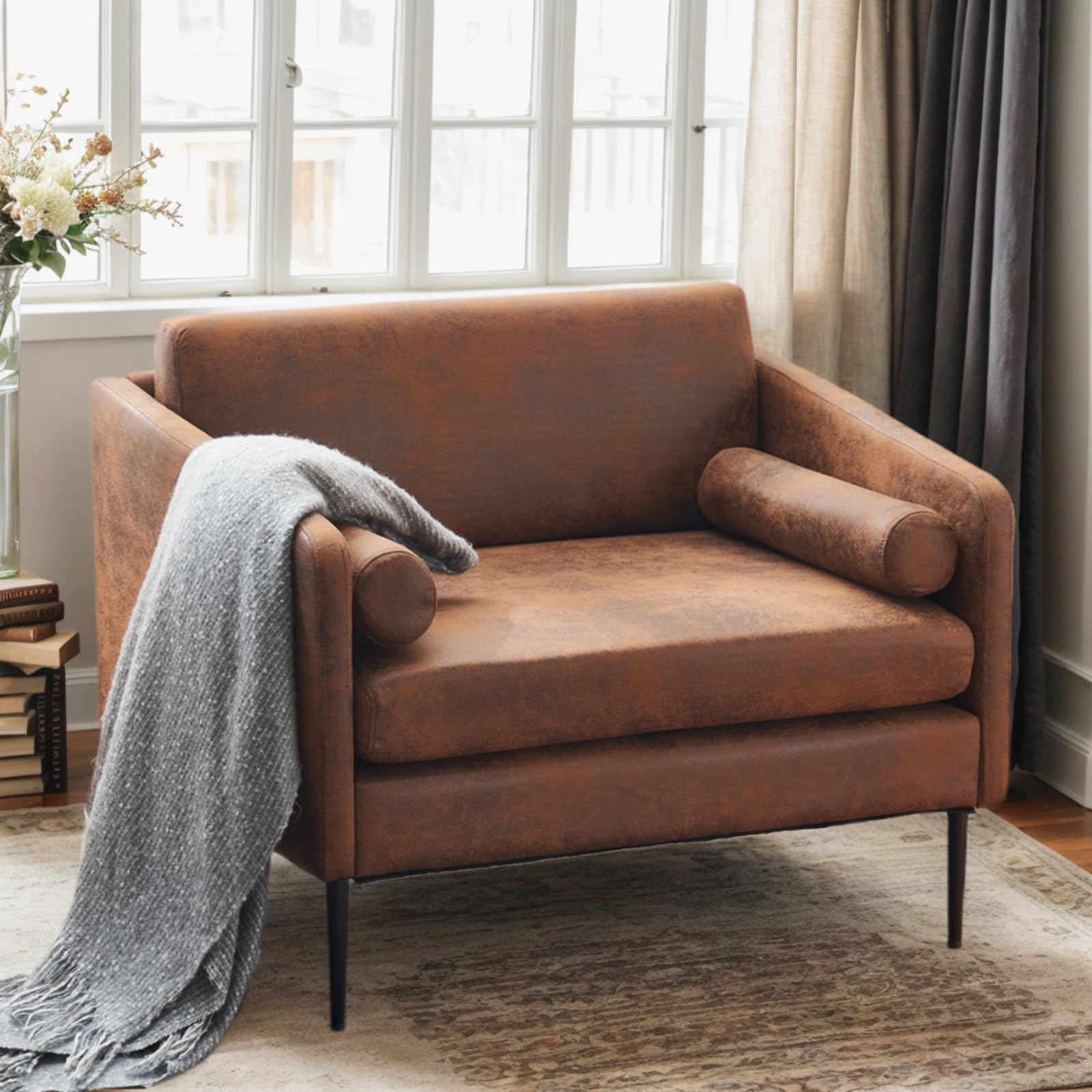 - MID-CENTURY CHARMING This 1.5-seat couch with mid-century style in brown is well blended in most decor themes. Featured with bronzing outward, it is kind of suitable furniture around your home. It will add a sense of sophistication to your space, which creates a homely feel and elegant vibe.