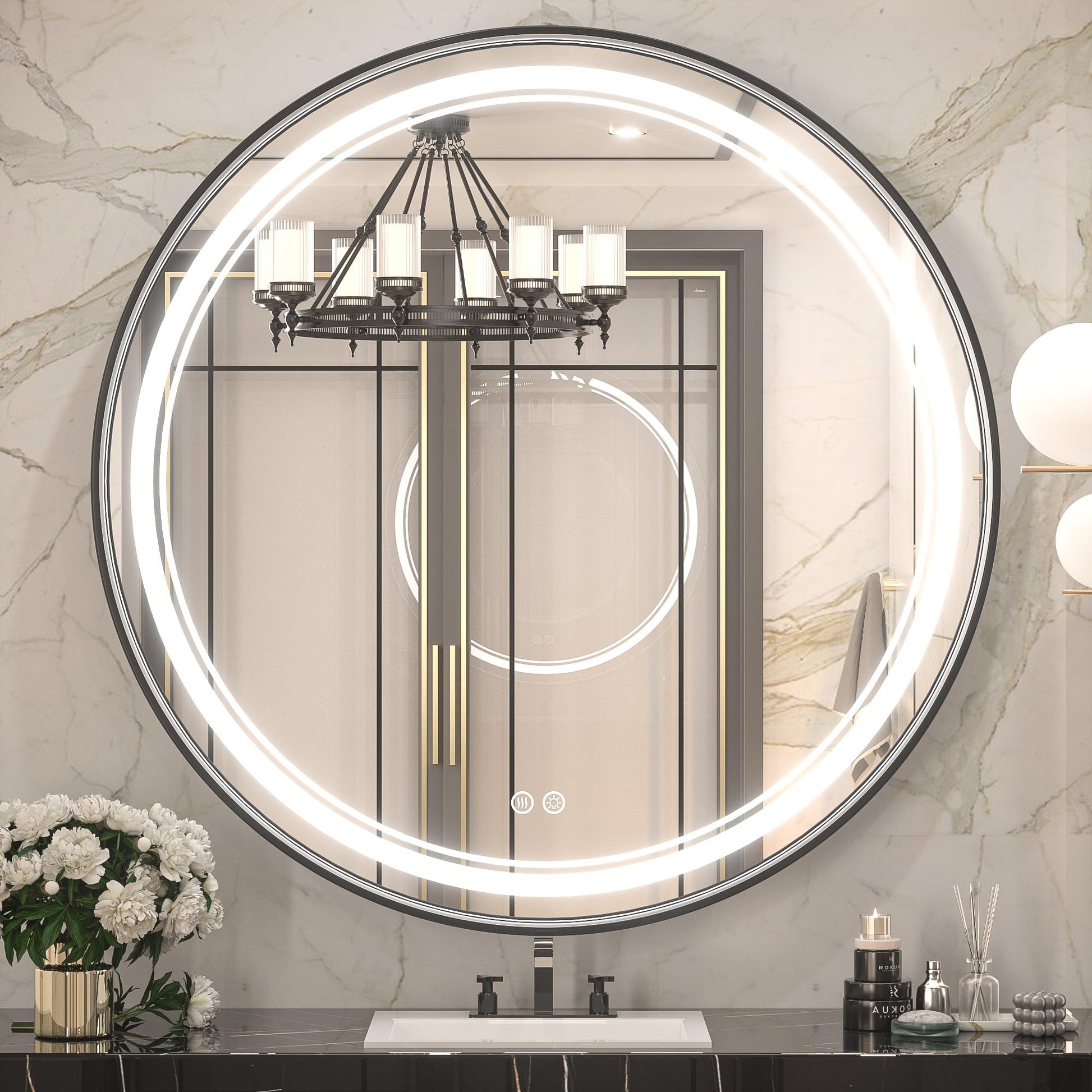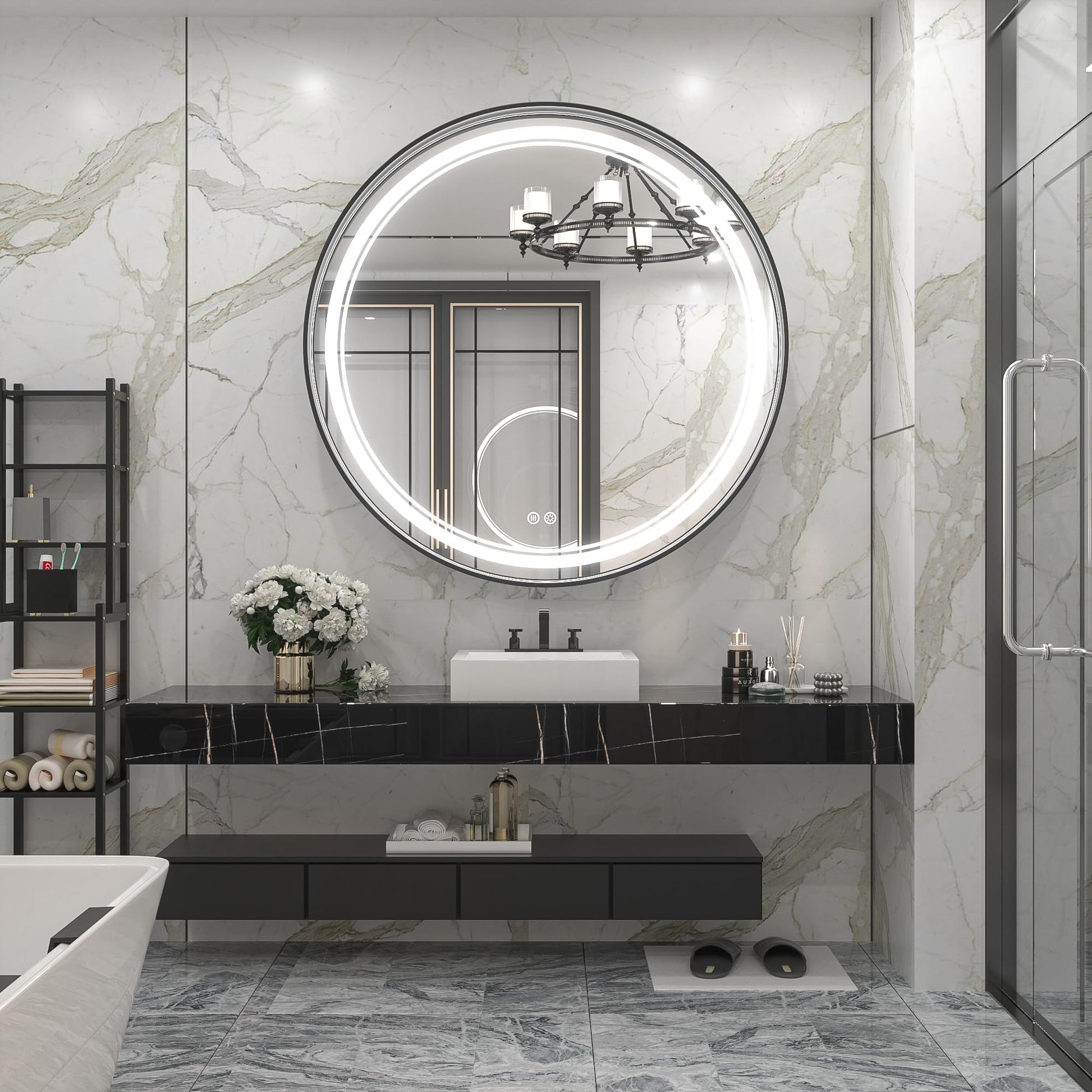 36 Inch LED Black Framed Round Mirror for Bathroom with Lights Wall Mounted Vanity