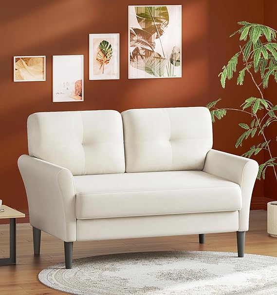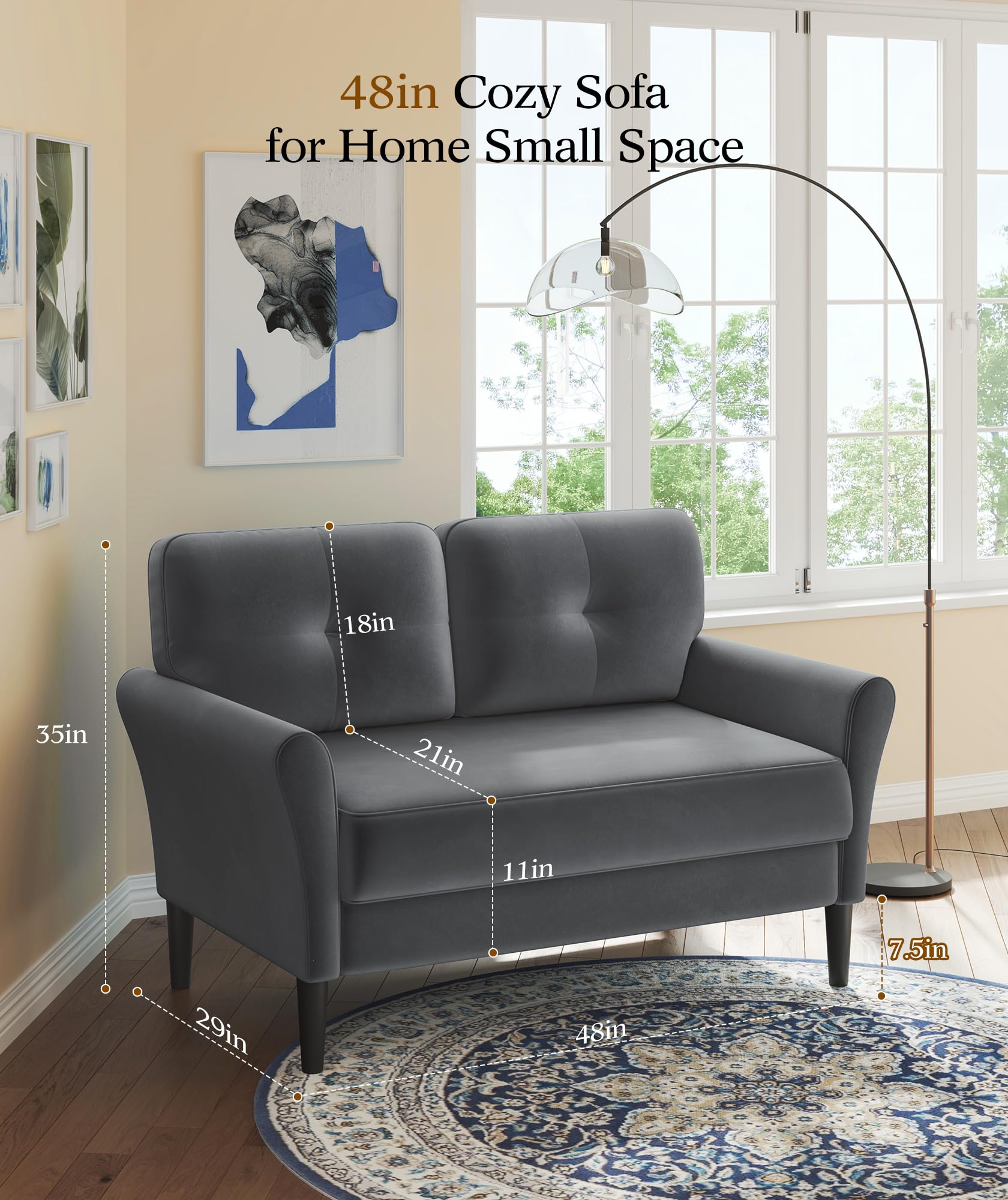 - Kidirect 48" small love seat sofa couch is perfect for cozy small areas. Measuring 48” W x 29” D x 35” H, it's a versatile piece that can be used as a rest area or reading corner in a child's room, or placed in small spaces like living rooms, bedrooms, apartments, attics, and more. The mini couch is perfect for you, your family, and your pets. In addition, its stylish and refined color seamlessly blends with various home decor styles.