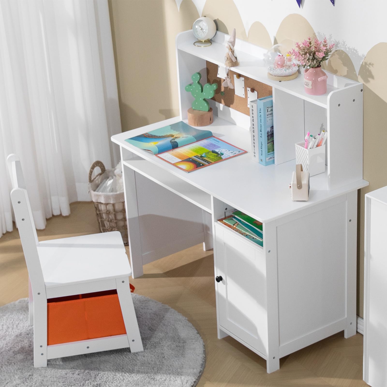 and Chair Set for Boys & Girls – Wooden Ergonomic Design, Includes Built-In Chair Storage Bins & Bookshelf Organizer & Cork Bulletion Board, for Children Studying, Writing, Drawing