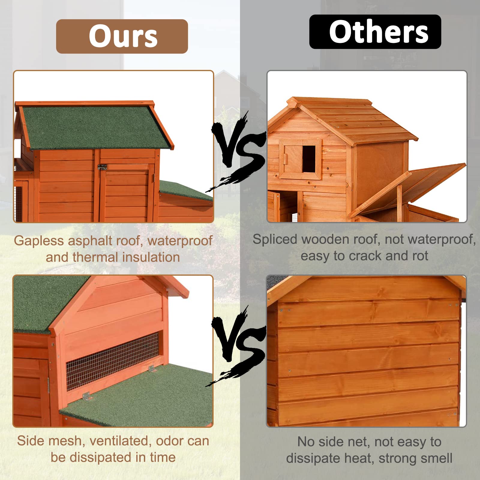 - This chicken coop is crafted of Fir wood and asphalt waterproof roof. Waterproof material keeps the chicken living environment dry. The sturdy shelter will keep your animals safely sheltered and durable for years of use.