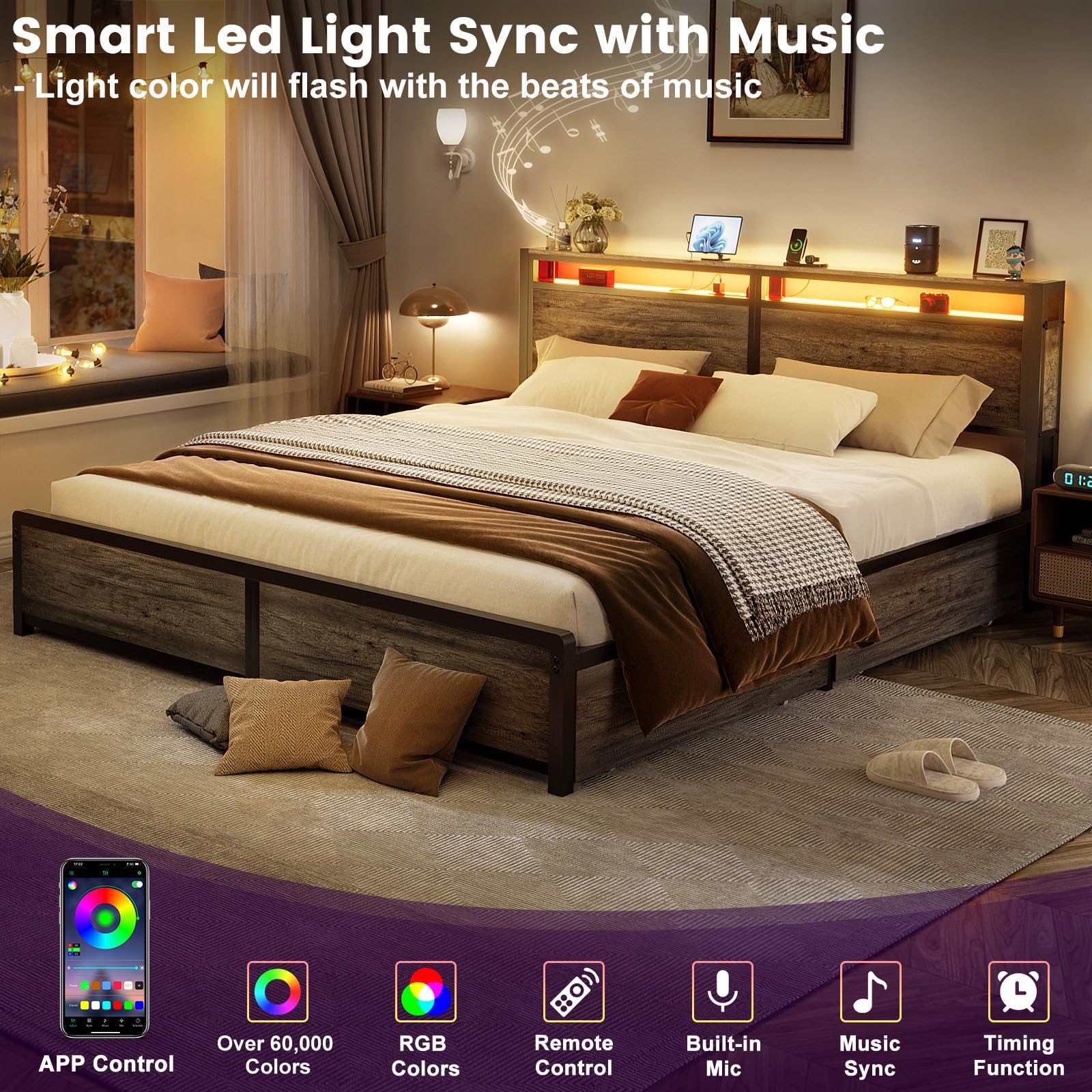 Transform your bedroom with this sophisticated king size platform bed that combines elegant design with practical functionality. Featuring four spacious storage drawers, a built-in charging station, and ambient LED lighting, this bed frame offers the perfect blend of style and convenience for modern living.