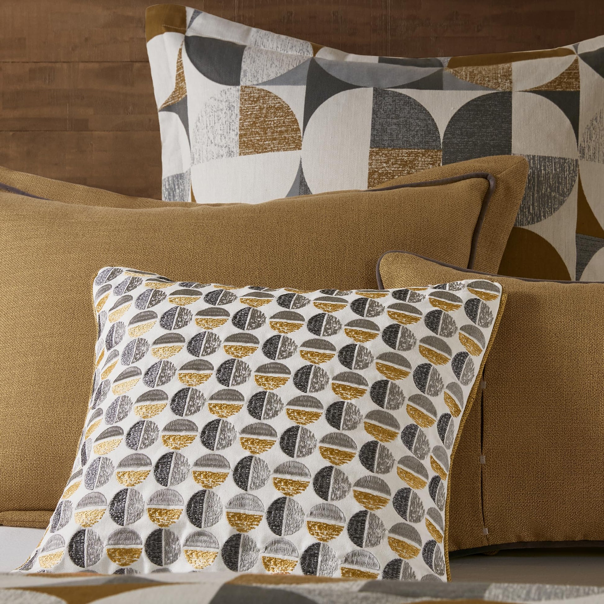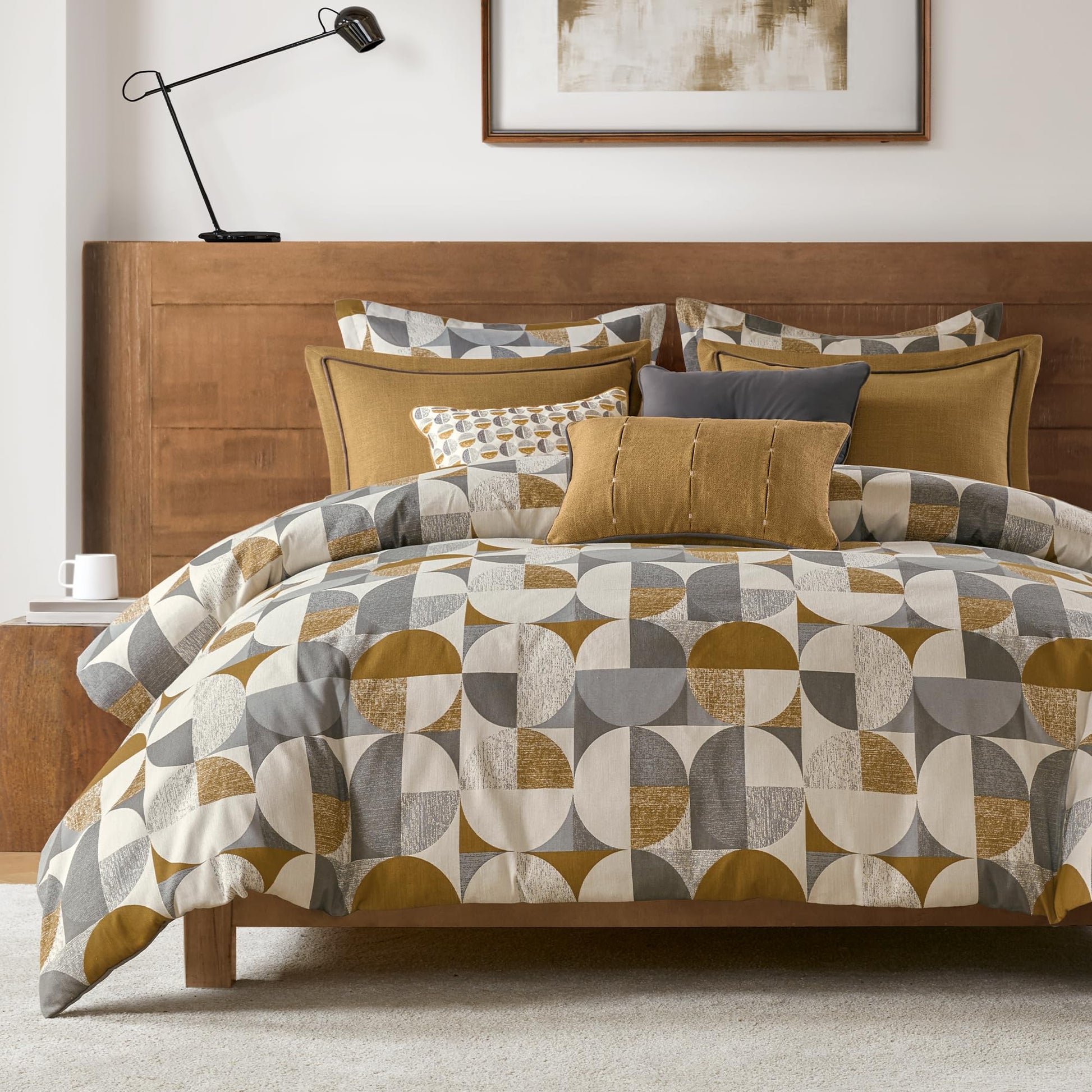 Elevate your bedroom with this luxurious king-size comforter set featuring an elegant Jacquard weave with Scandinavian-inspired geometric patterns. The Cirque collection combines sophisticated gold tones with premium construction for year-round comfort and style.