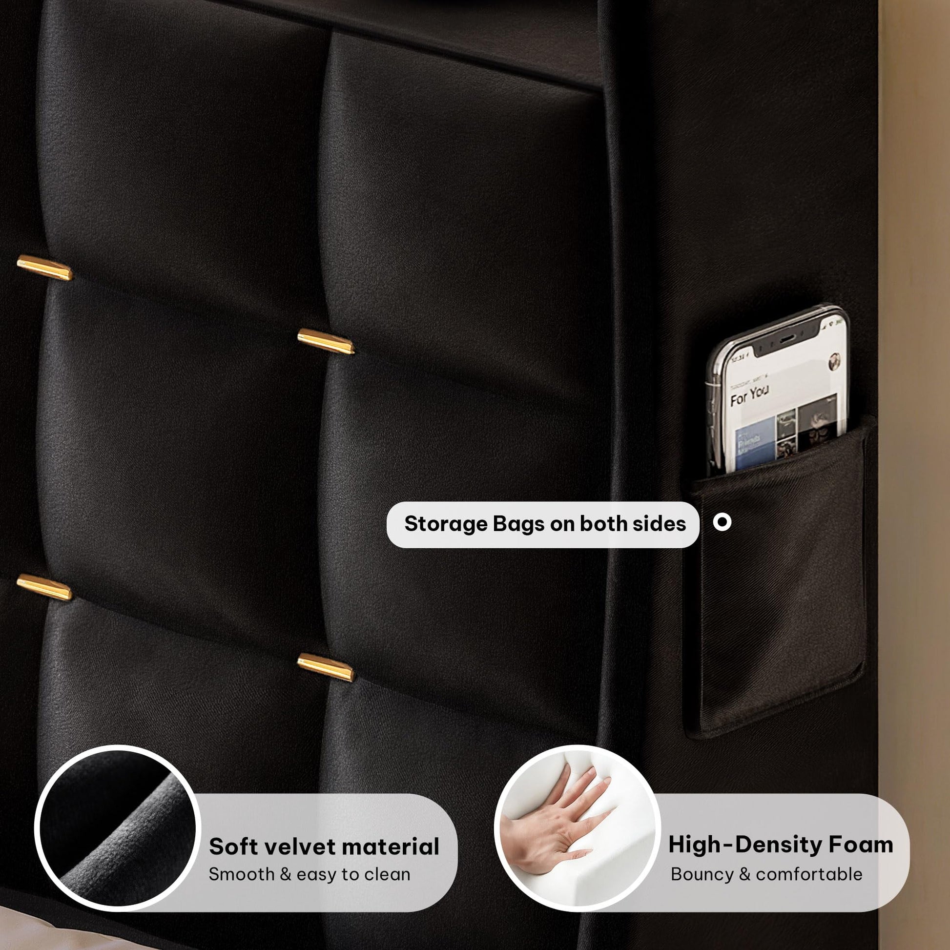 Transform your bedroom into a luxurious retreat with this sophisticated king-size platform bed frame. Featuring plush velvet upholstery in elegant black, this bed combines contemporary design with practical functionality. The integrated RGB LED lighting creates customizable ambiance, while the built-in charging station keeps your devices powered and within reach.