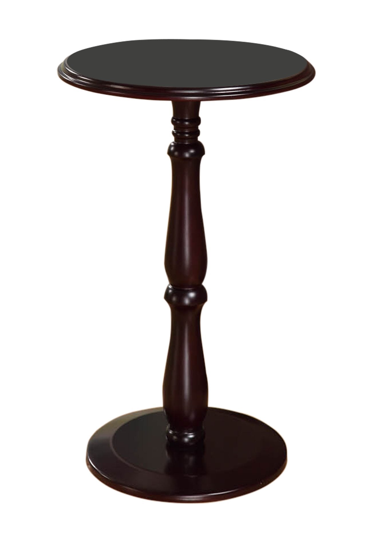 - Crafted of wood, this timeless table offers a turned pedestal base and a glossy dark finish to make it stand out.