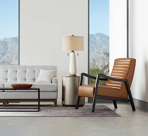 Elevate your interior with this sophisticated mid-century modern table lamp featuring a distinctive white grooved ceramic base and warm taupe drum shade. The textured ceramic construction creates visual interest while the classic silhouette complements both contemporary and traditional décor.