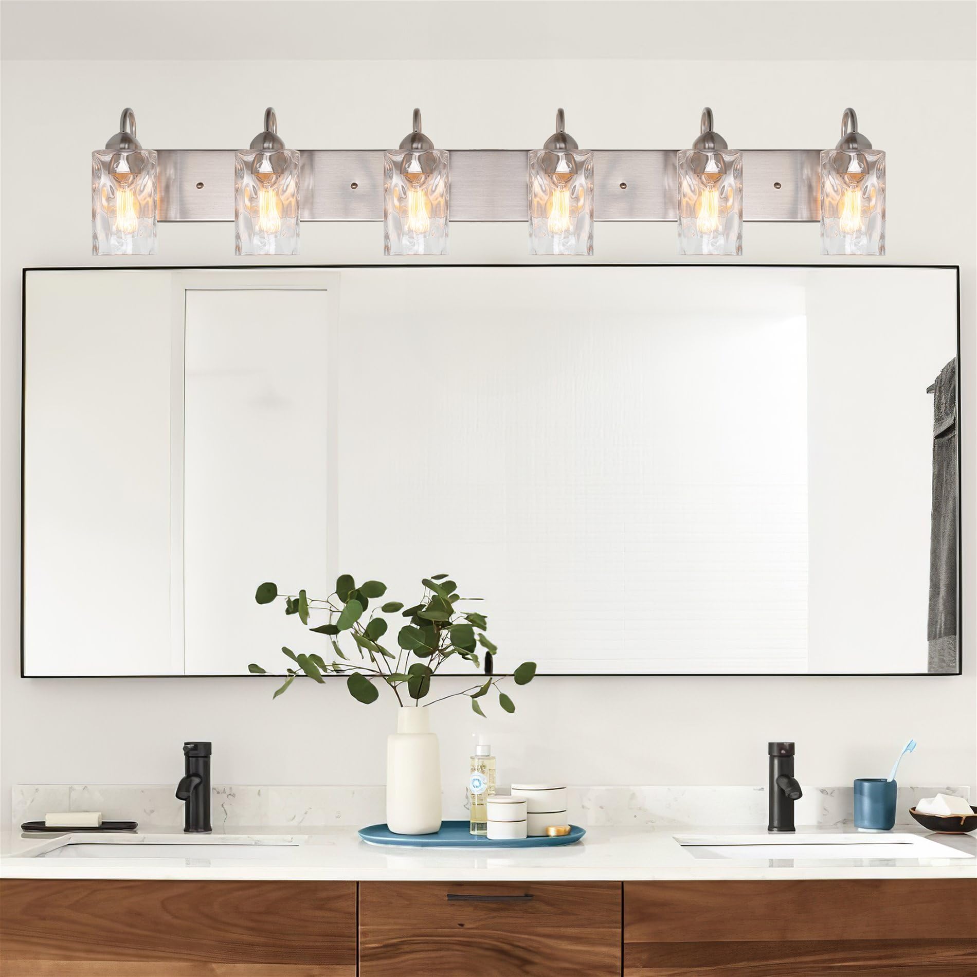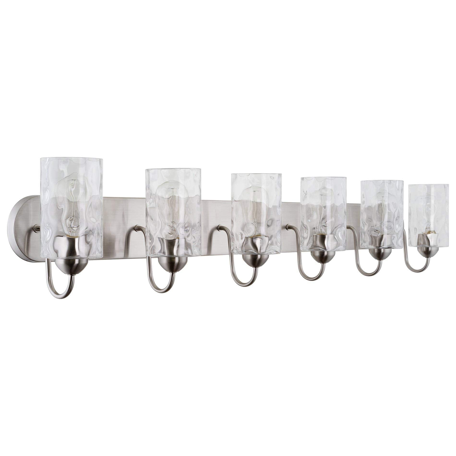 - The 6-light vanity light showcases a classy design, featuring a gorgeous brushed nickel finish that instantly upgrade your bathroom or powder room. This bathroom light's curved gooseneck arms and hammered cylinder glass shades emit a bright glow, making it a prime choice among interior designers and builders for both new construction and remodel projects