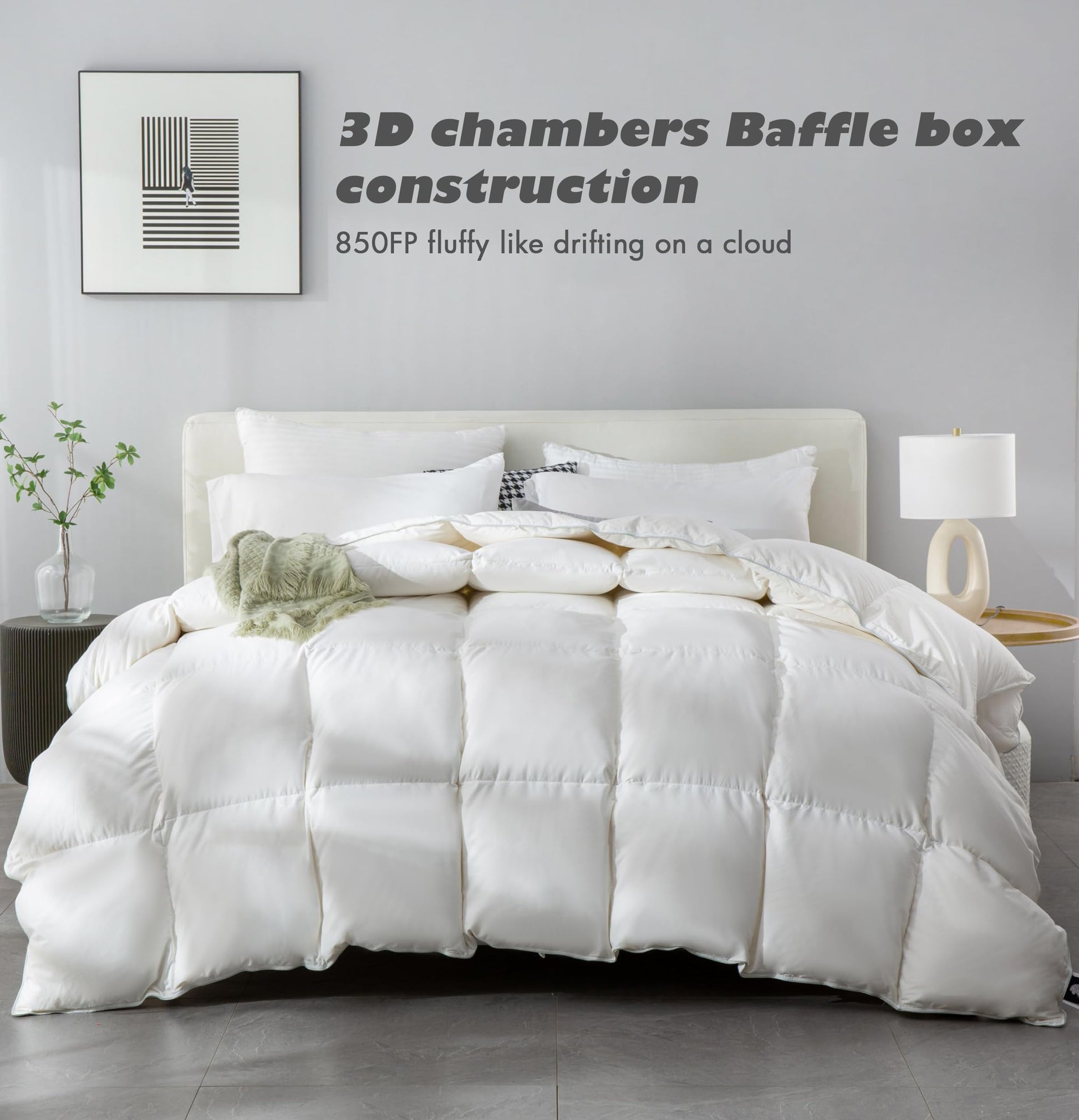 - Cloud Like- Baffle box construction features 3D chambers that hold down clusters, helps keep down lofty and evenly distributed for cozy, fluffy comforter, the feathers down filling remains in place even after shaking, so there are no cold spots, surprisingly lightweight but also incredibly warm, it feels like you're sleeping under a cloud. This queen comforter keeps their dreamy loft night after night