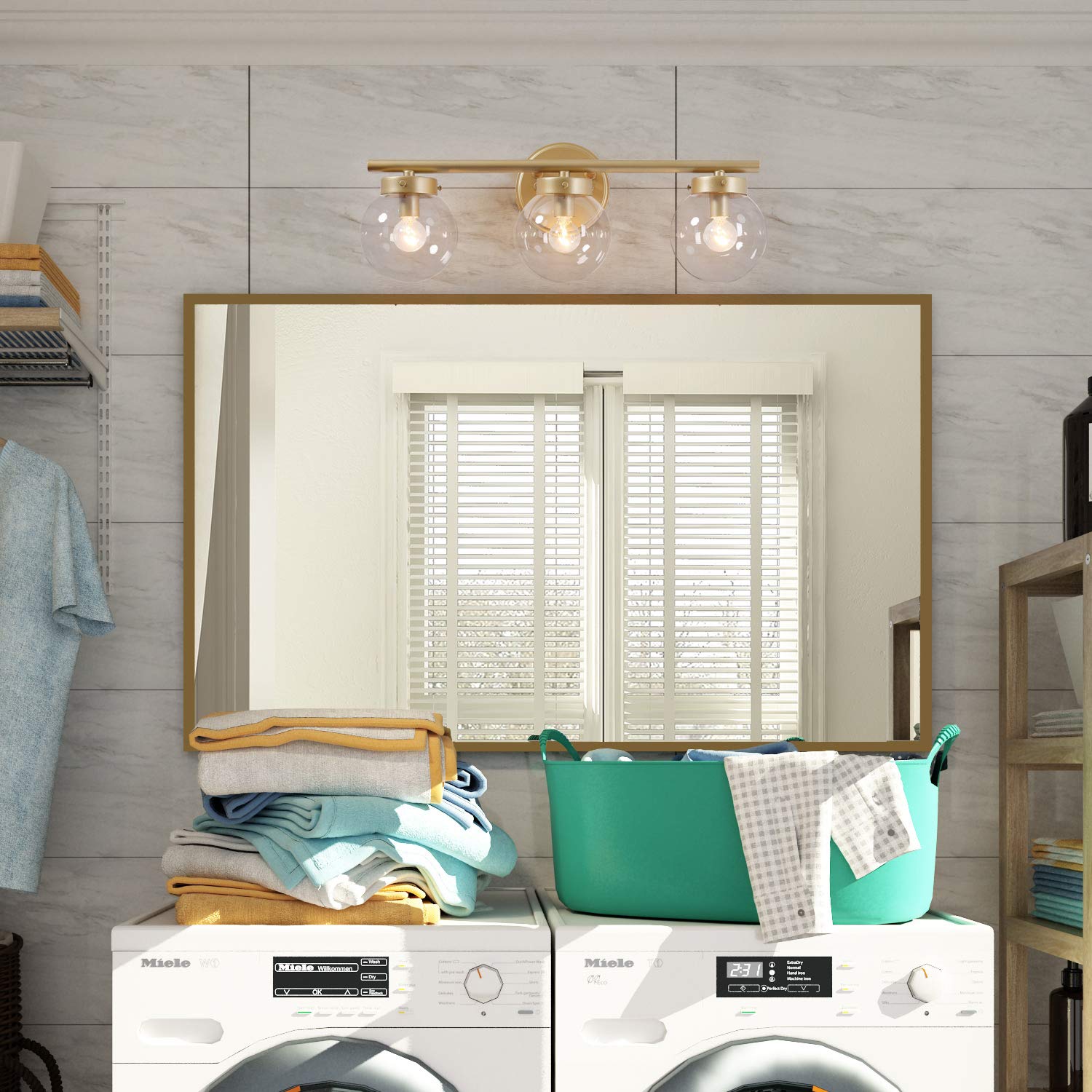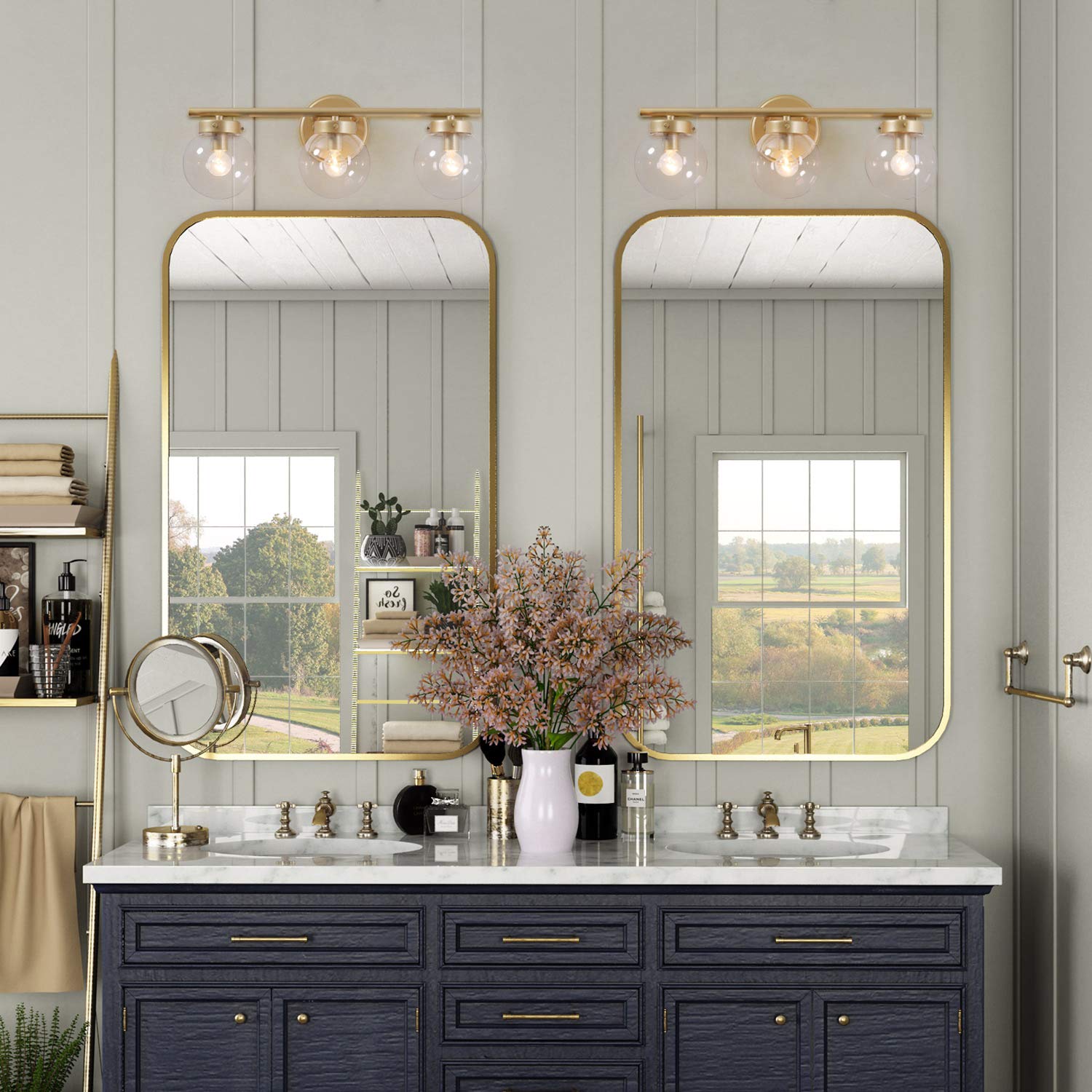 - The bathroom lights over mirror are defined by clean lines. Golden finish gives it an urban rustic appearance. Clear round glass shades give it a romance and elegance touch of mid-century.