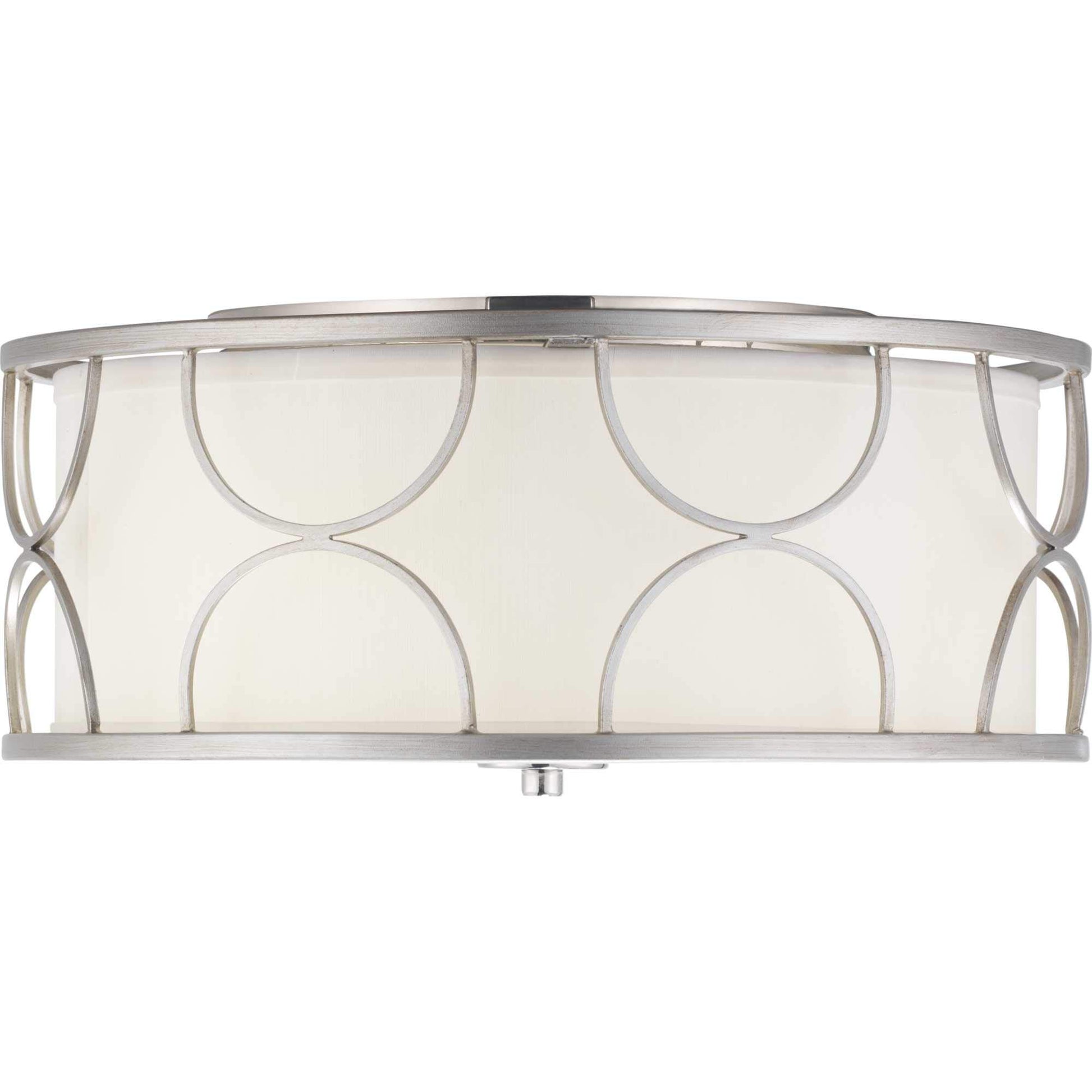 The Landree Collection features a striking Silver Ridge geometric frame designed to dramatically surround a white silk shade, presenting depth, dimension, and beauty. The exaggerated scale and elegant accents make this three-light flush mount suitable for modern and luxury interior design styles.