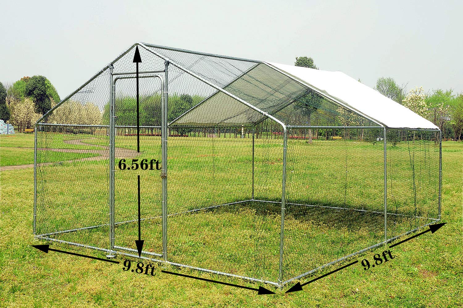 - The chicken run for yard with cover measures 9.84 x 9.84 x 6.56 ft, gives your chickens enough space to run and rest freely and lets them find all kinds of small insects, maintaining their predatory nature and growing healthily. Whether it's on the farm or in the backyard. In addition, The chicken coop run suits your raising rabbits, guinea pigs, chickens, ducks, geese, chinchilla, ferret, gerbil, poultry, or other pets.