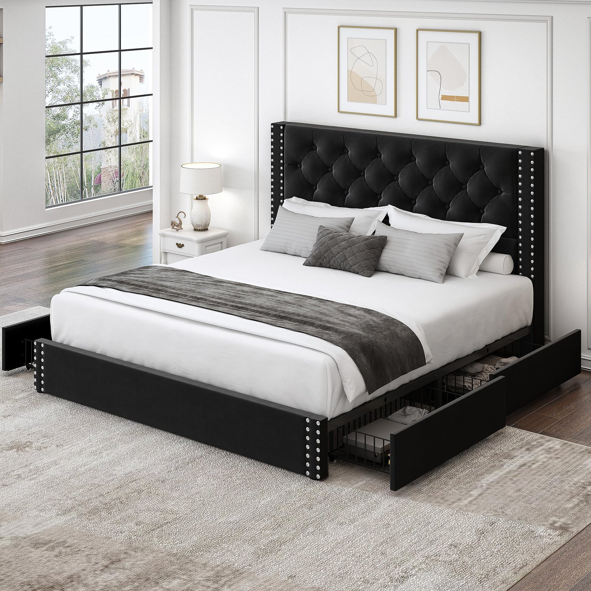 LARMACE Queen Size Upholstered Bed Frame with Storage Velvet Platform Tufted Bed Frame with 4 Drawers and Headboard, Wood Slats Support, No Box Spring Required, Noise-Free, Black