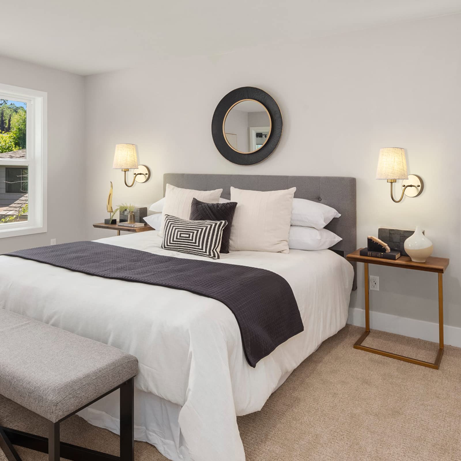 - [Ideal Size & Easy Installation]- Measured 5.9” D x 10.78” W x 10.04” H in dimension of the sconce, 4.72” of in diameter of mounting plate, 5.9” W x 5.5” H in dimension of fabric shade, this gold wall light set of two is easy to install as all necessary mounting hardware and installation manual are included. Orange wiring caps make wiring easy also[Wide Application] The modern wall sconces set of two are ideal as wall lights for bedroom, wall lights for living room, bathroom vanity light, wall lights for hallway, bedside lights wall mounted or wall lamps for dining room, kitchen, stairway, reading room, foyer, porch, etc.