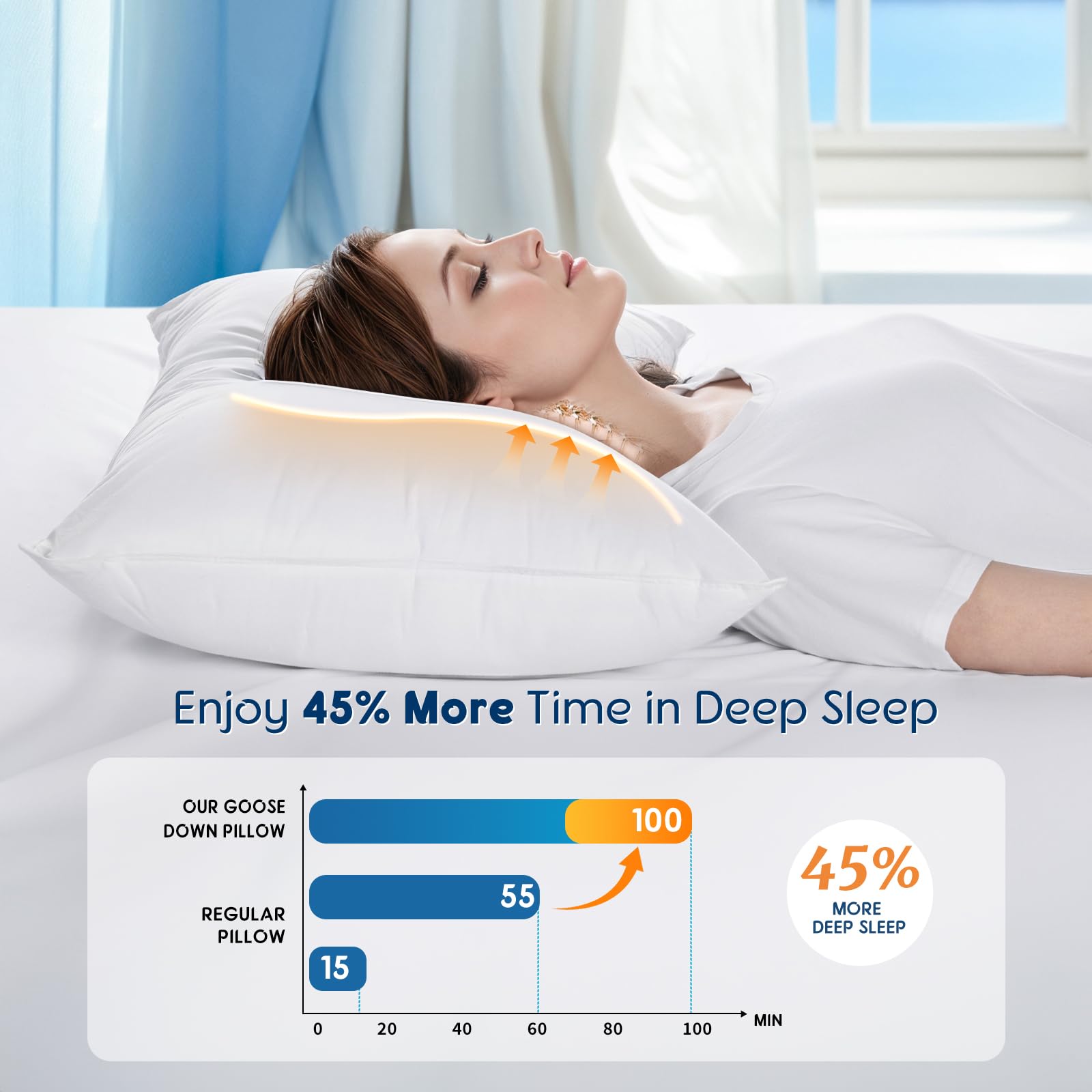 - Skin Friendly Bed Pillows: Sleep comfortably with our goose-down pillow, encased in a 100% cotton pillowcase that's soft, breathable, and gentle on your skin. The natural cotton cover ensures a smooth, skin friendly surface, making it perfect for sensitive skin and a restful night