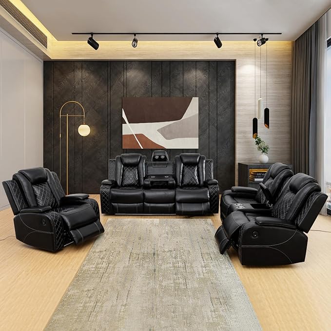 - Equipped with thick cushions and sponge-padded armrests, this living room recliner set offers comfort and versatility. It's suitable for various spaces like living rooms, bedrooms, apartments, home theaters, and offices. Each power recliner sofa set features a built-in USB port, allowing you to conveniently charge your devices without leaving your seat.