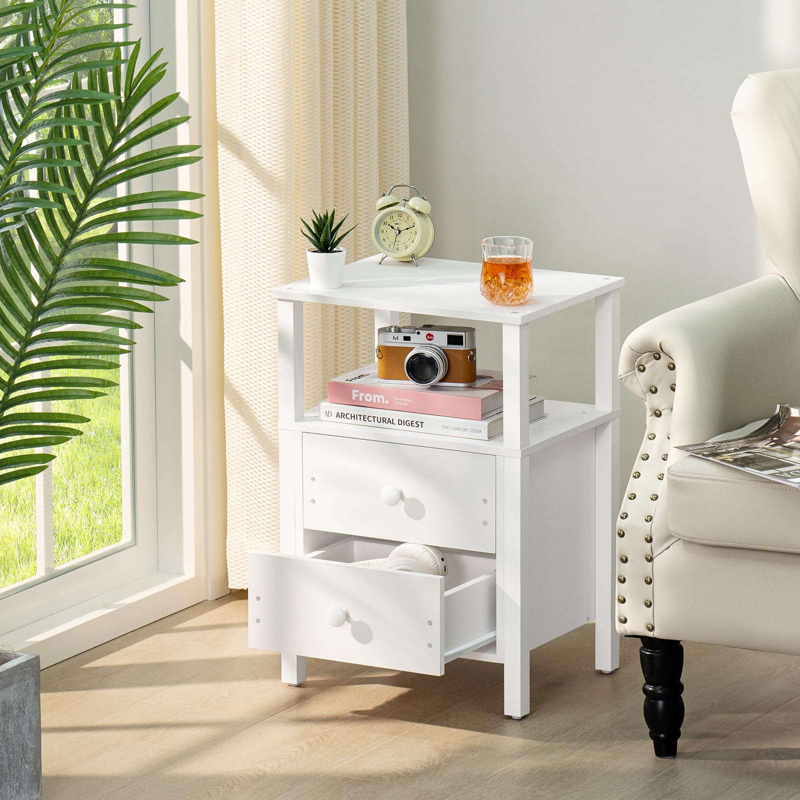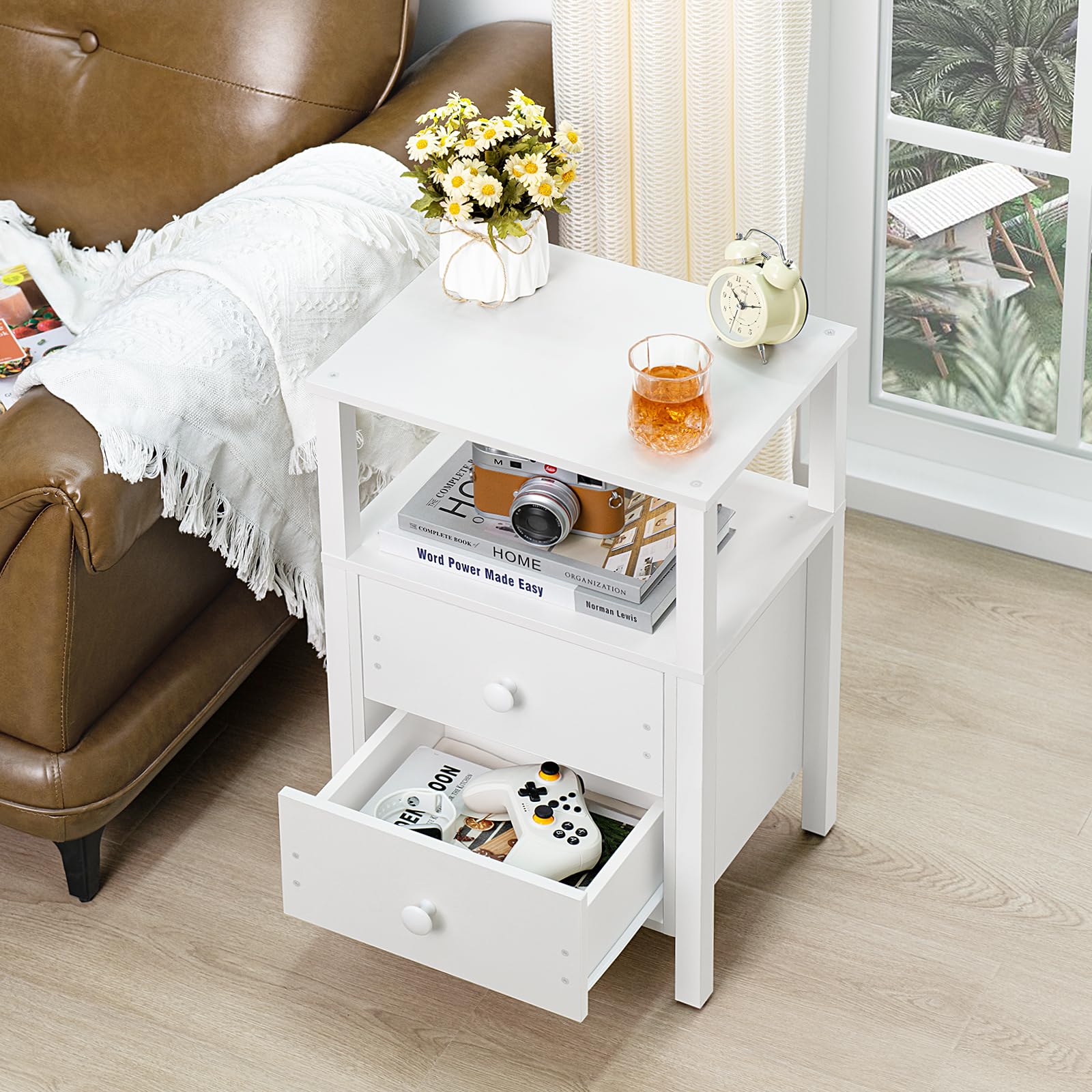 White Night Stand, Small Nightstand with 2 Wood Drawers and Storage Shelf, Modern
