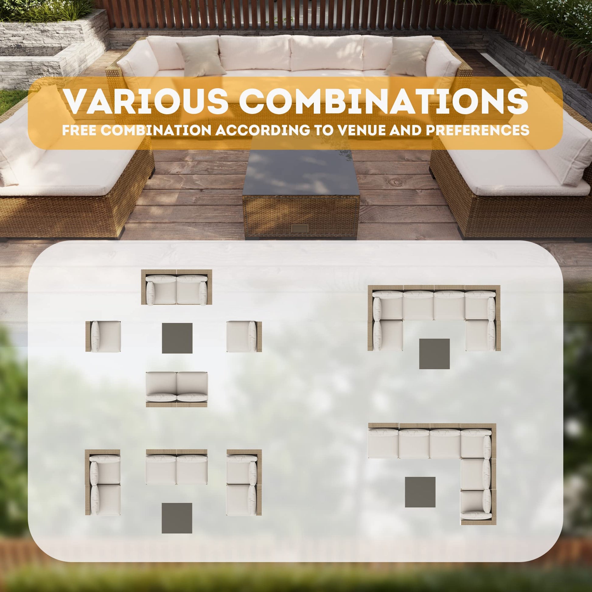 - INFINITE COMBINATION - 7 pieces outdoor sectional sofa includes 2 corner sofas, 4 armless sofas, 1 coffee table with tempered glass top, extra seat clips to keep sofas from sliding apart, adjustable footrest to keep balance. There are 3 boxes in total and they may be delivered in different days.