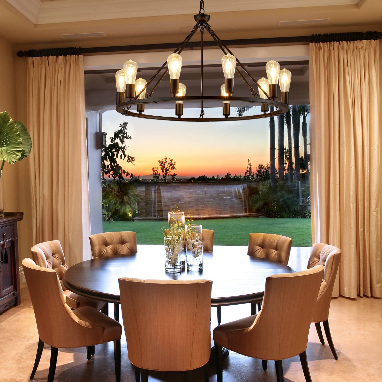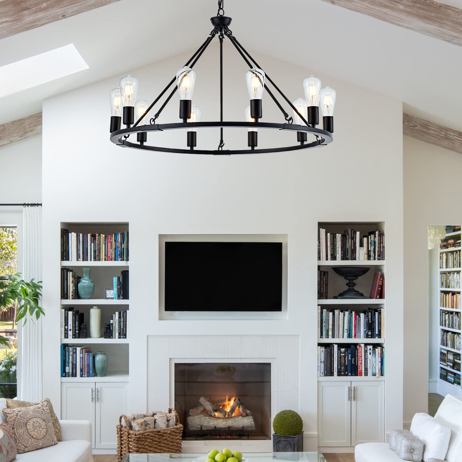 - The vintage wagon wheel chandelier full of allure, it comes with matt black high-quality metal lamp body and 10 lamp heads, fully lighting up your house with a retro atmosphere and comfortable feeling.