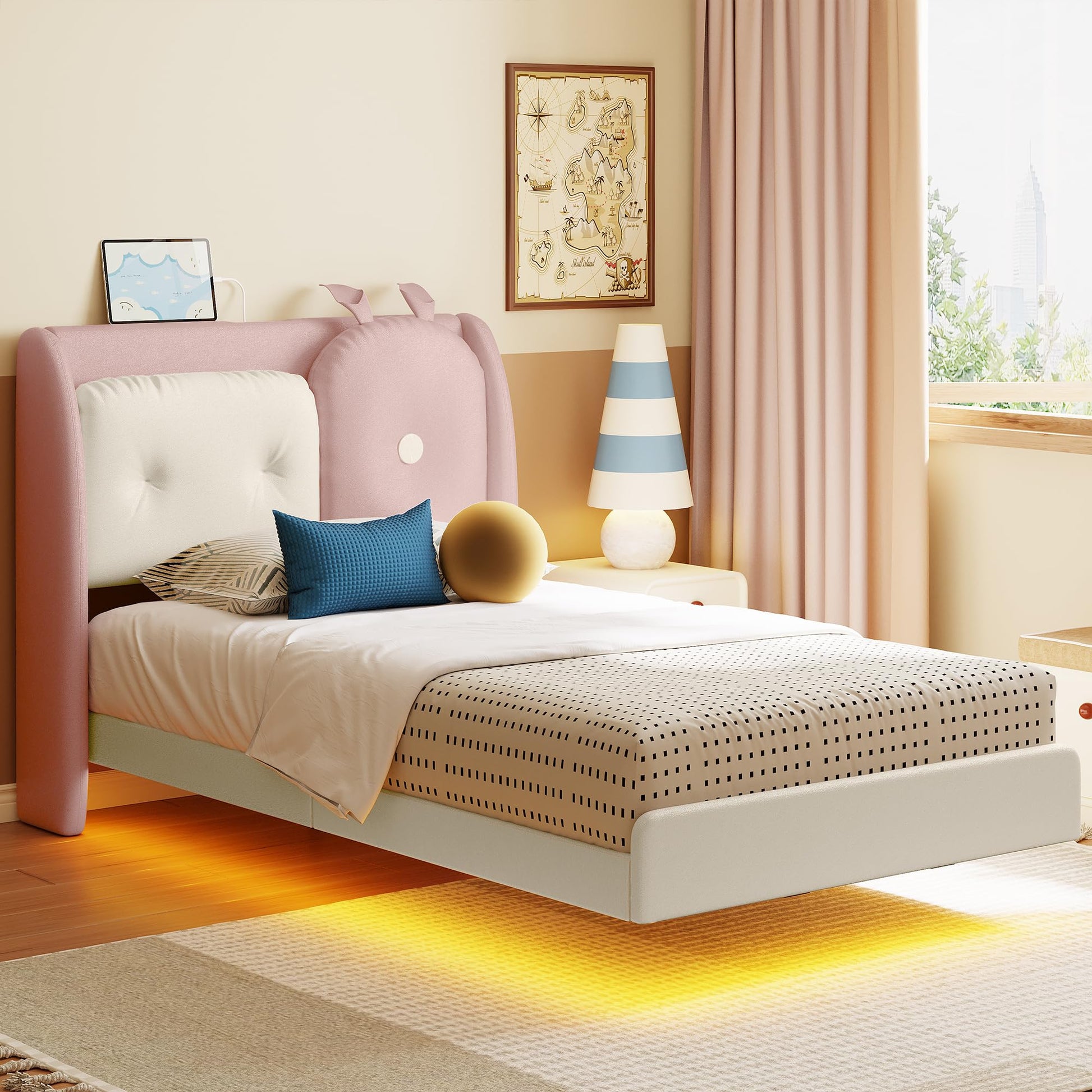 - MODERN KIDS BED FRAME: Made of high-quality faux leather and complemented by a cute rabbit-ear-shaped headboard, LIKIMIO bed is not only beautiful and generous, but also soft and delicate to the touch, adding fun to your child's bedroom.