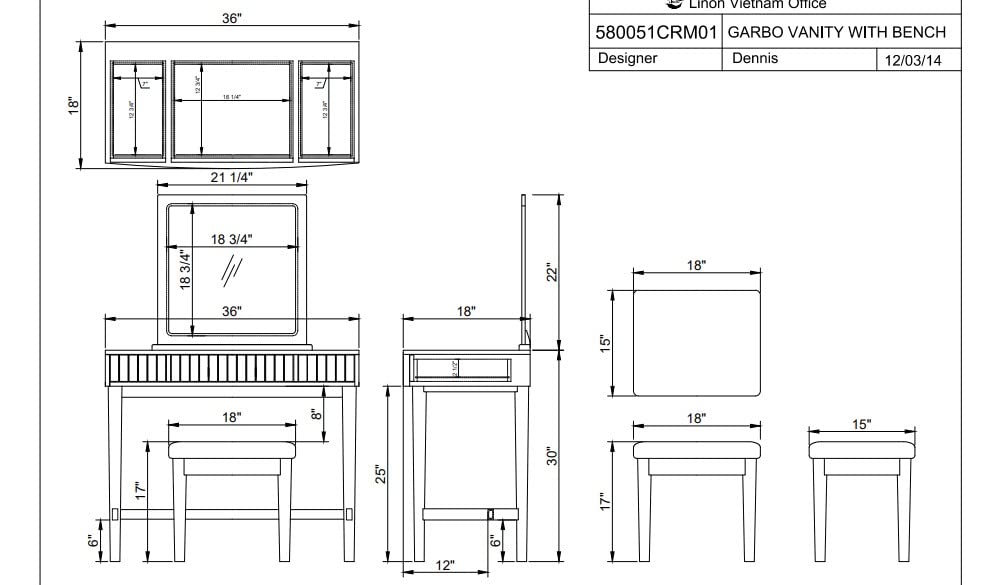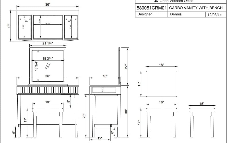 - Vanity with Mirror : 36"X18"X52"Vanity : 36"X18"X30" 48. 84 lbs. Stool : 18"X15"X17" 11 lbs.