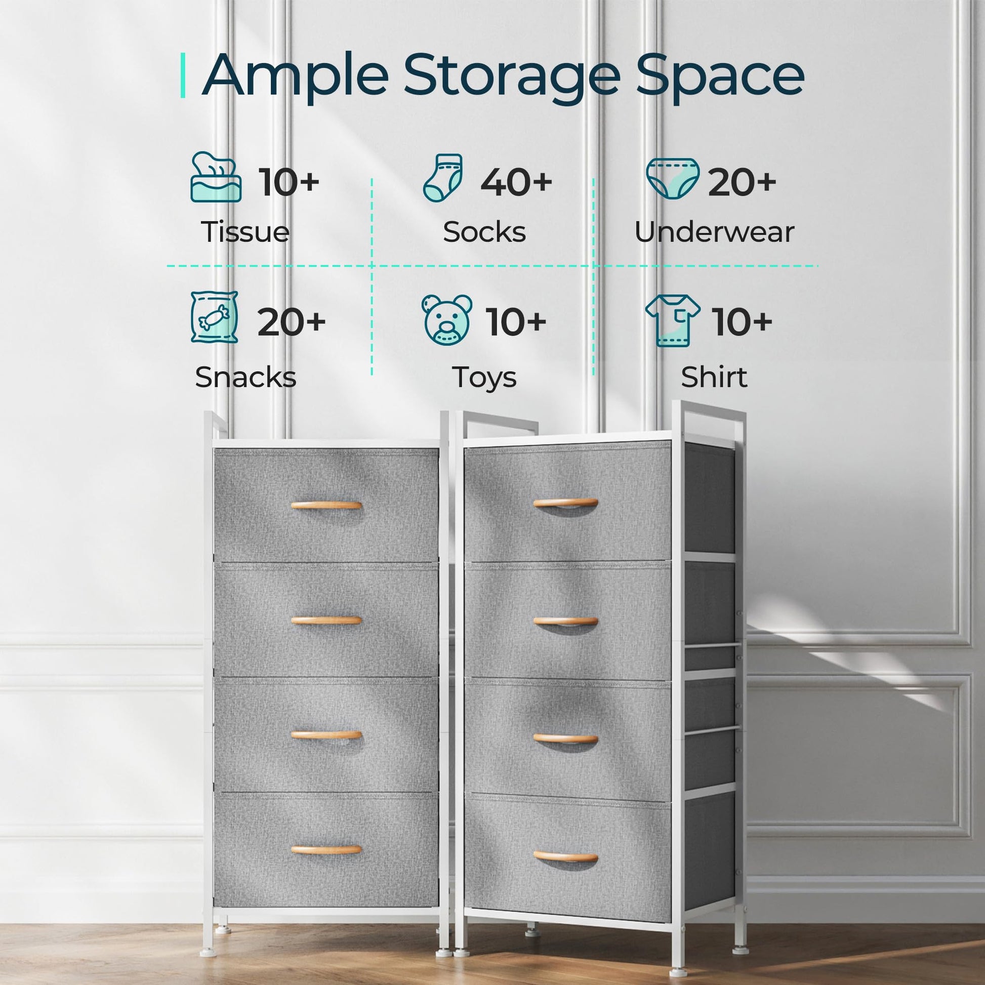 - This dresser chest is full and there's no place for pajamas,blankets, bit and piece.This dresser tower organize them in 4 spacious fabric drawers, good for the limited space.