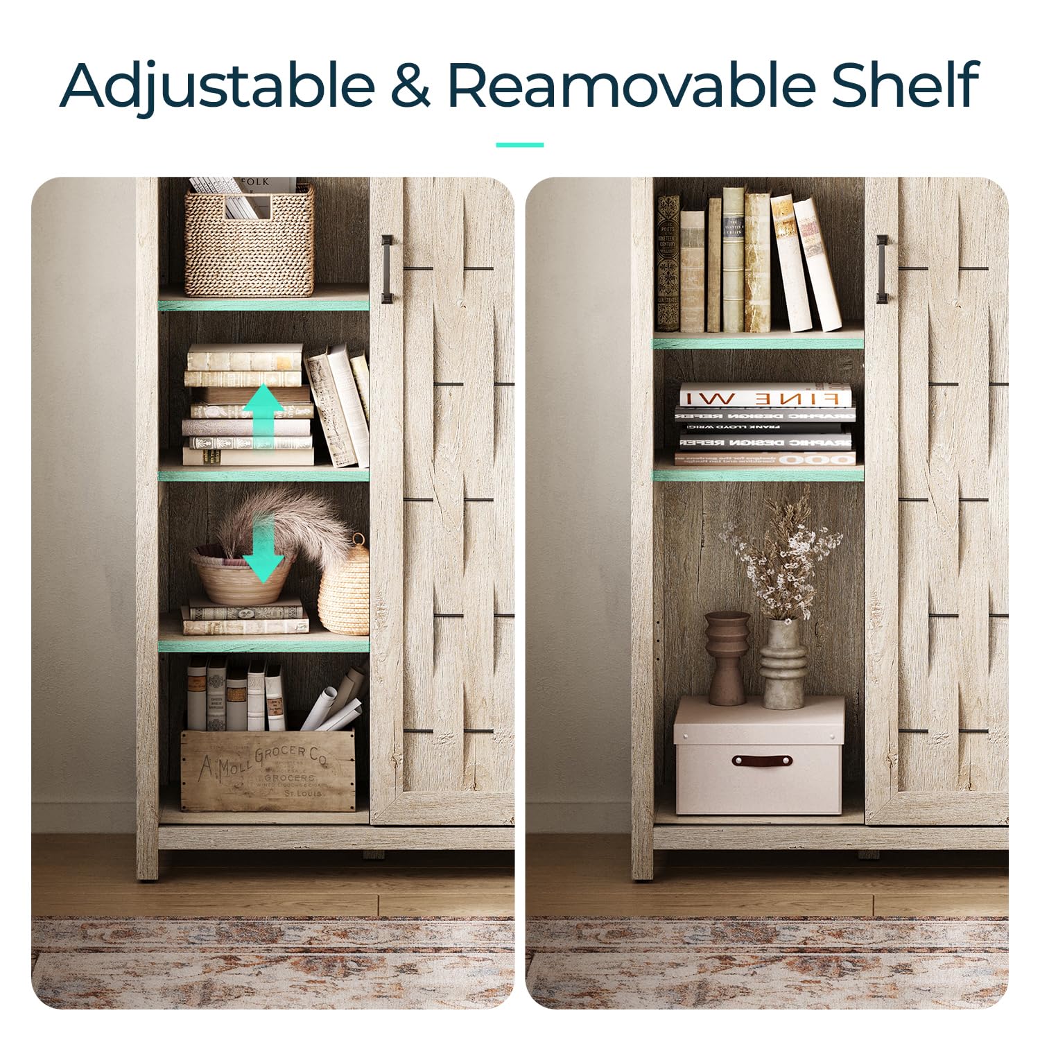 - Barn Door Convenience - This pantry cabinet boasts a sliding barn door, offering easy access to essentials while infusing your storage solution with both character and functionality. Besides, the bookshelf come with an adjustable levelers on the legs minimize minor door misalignment caused by uneven floors