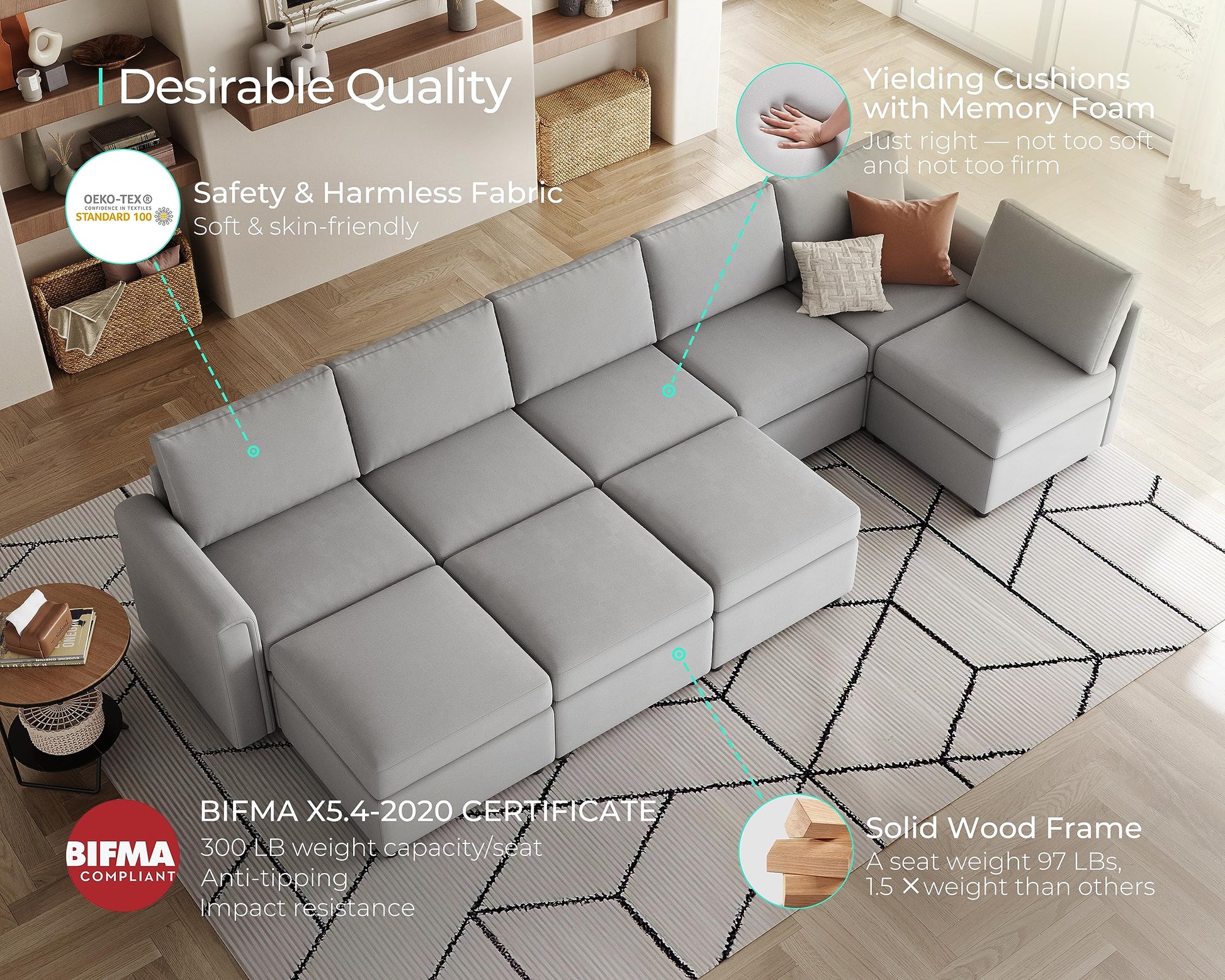 - - The yielding cushions of large sectional couch's are filled with memory foam and steel springs for your relaxation and comfort. The seats are just right — not too soft and not too firm. The sofa fabric is tightly woven 100% polyester, CA65 and OEKO-TEX certificated, which means you can be certain that every component of this article has been tested for harmful substances and that the article therefore is harmless for human health