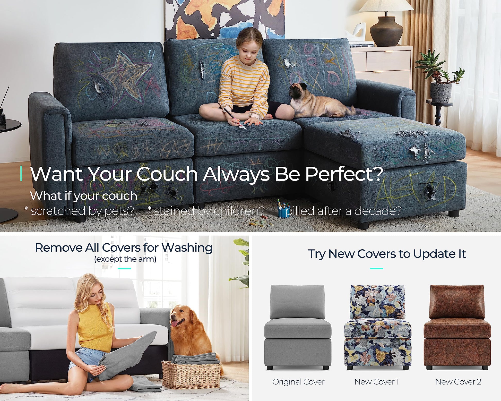 - Imagine if your sleeper couch covers are scratched by pets or stained by children, or you get tired of the old color in the future, you may prefer a sofa with changeable covers. LINSY HOME modular sofa gives you the freedom to reinvent your couch anytime with removable, changeable, and machine-washable covers(except the armrest). Please note: For more cover options please contact our customer service