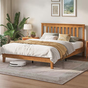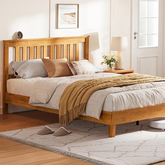 - WOOD BED FRAME: This queen size bed frame masterfully blends aesthetic appeal with functional design, offering rustic simplicity complemented by classic sensibility. The bed frame with headborad crafted with solid wood, its clean lines and wooden strip headboard add textural warmth while delivering both comfort and chic. The timeless design complements various decor styles and furniture, creates a sophistication and serene aesthetic.