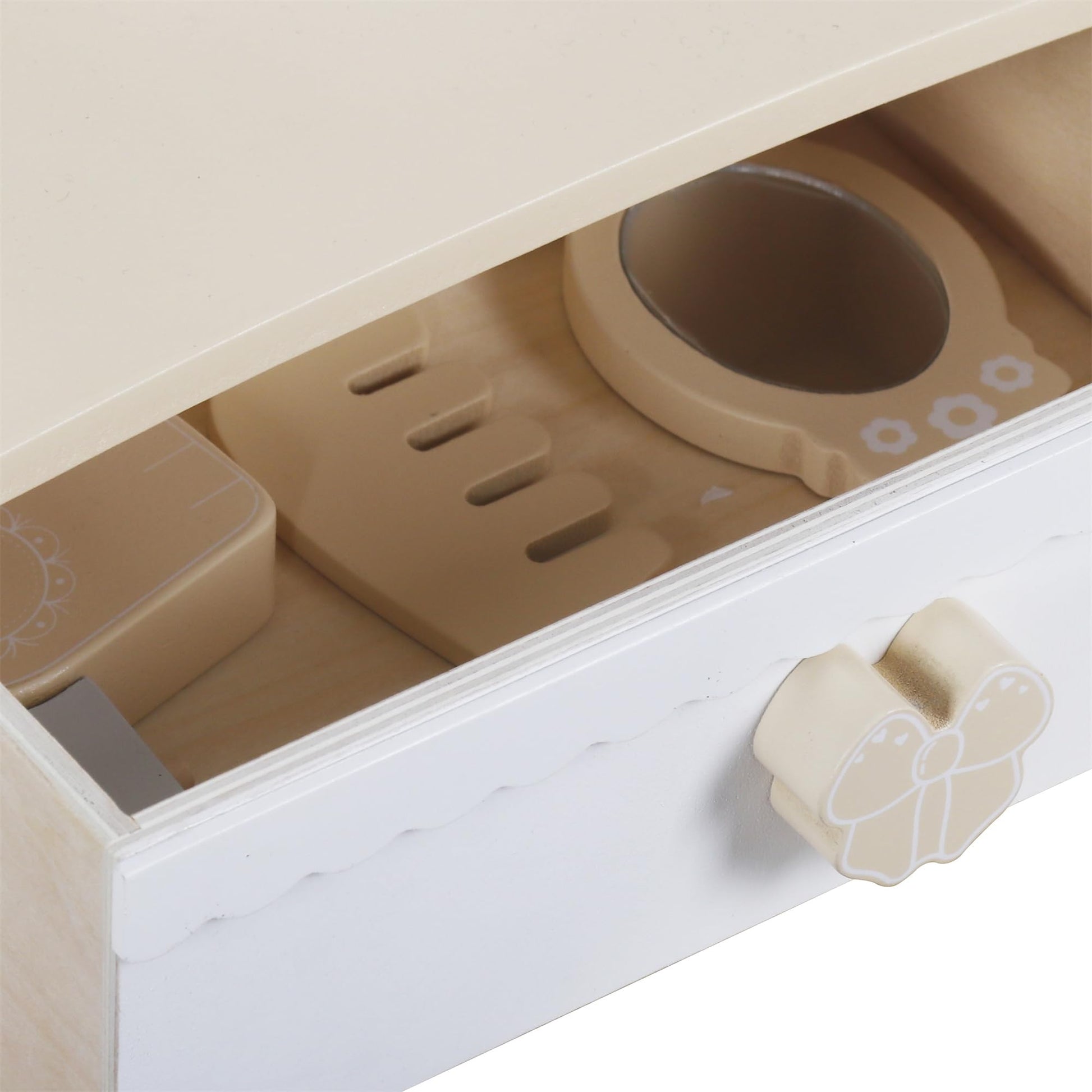 - Simulated Design - The mini white and natural wooden dressing table is equipped with a mirror. The spacious drawer can easily accommodate all accessories, it contains everything that every little princess needs, such as a hairdryer, straightener, eyeshadow palette, hairbrush, mirror, powder box, perfume, hair rope, nail polish, and lipstick. The numerous accessories add variety to the game.