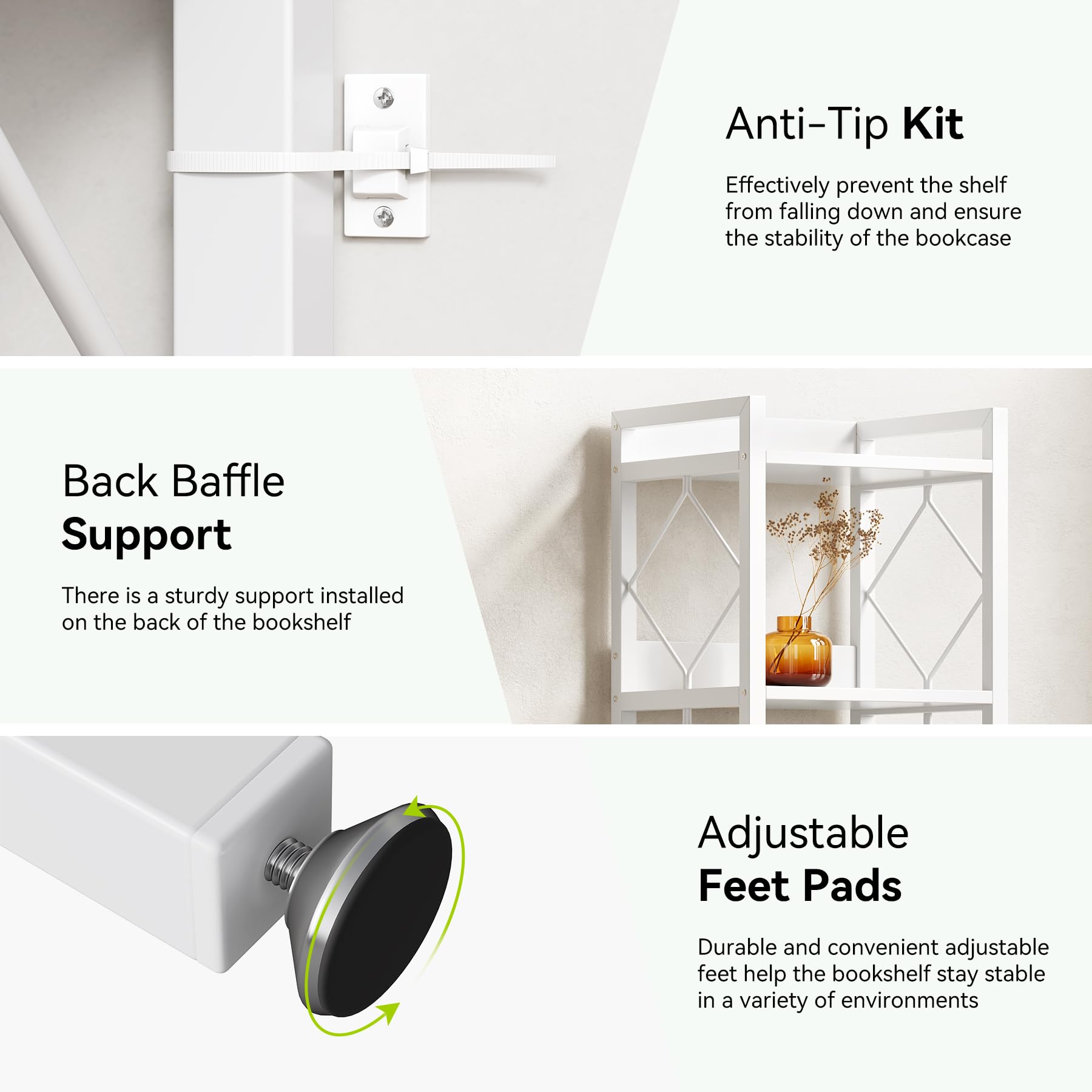 - Stability: This bookshelf features raised panels at the back and a modern diamond pattern on both sides to prevent items from falling and add aesthetic appeal. For added safety, a wall anti-tip kit is provided to prevent the bookshelf from tipping over