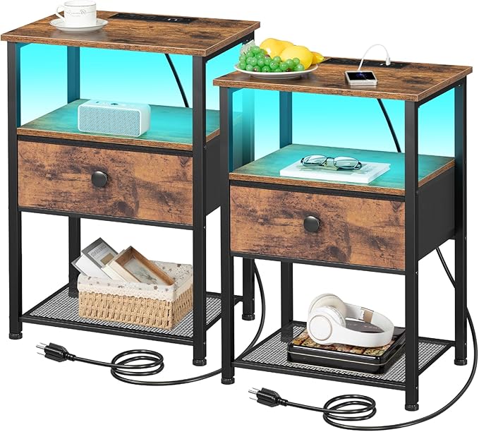 - Lightweight and Long-Lasting: Our night stands for bedroom set of 2 are made of P2 particle board and carbon metal. The small end table is easy to clean and maintain.The fabric drawer design of the LED nightstand not only provides you with perfect storage space, but also greatly reduces the weight of the nightstand so that you can move the 2 set of nightstands easily