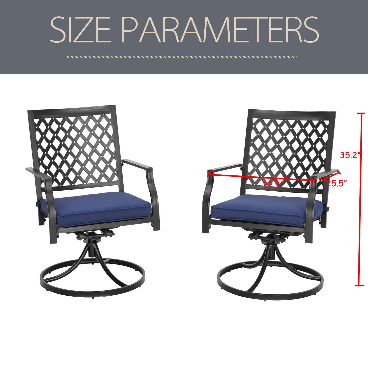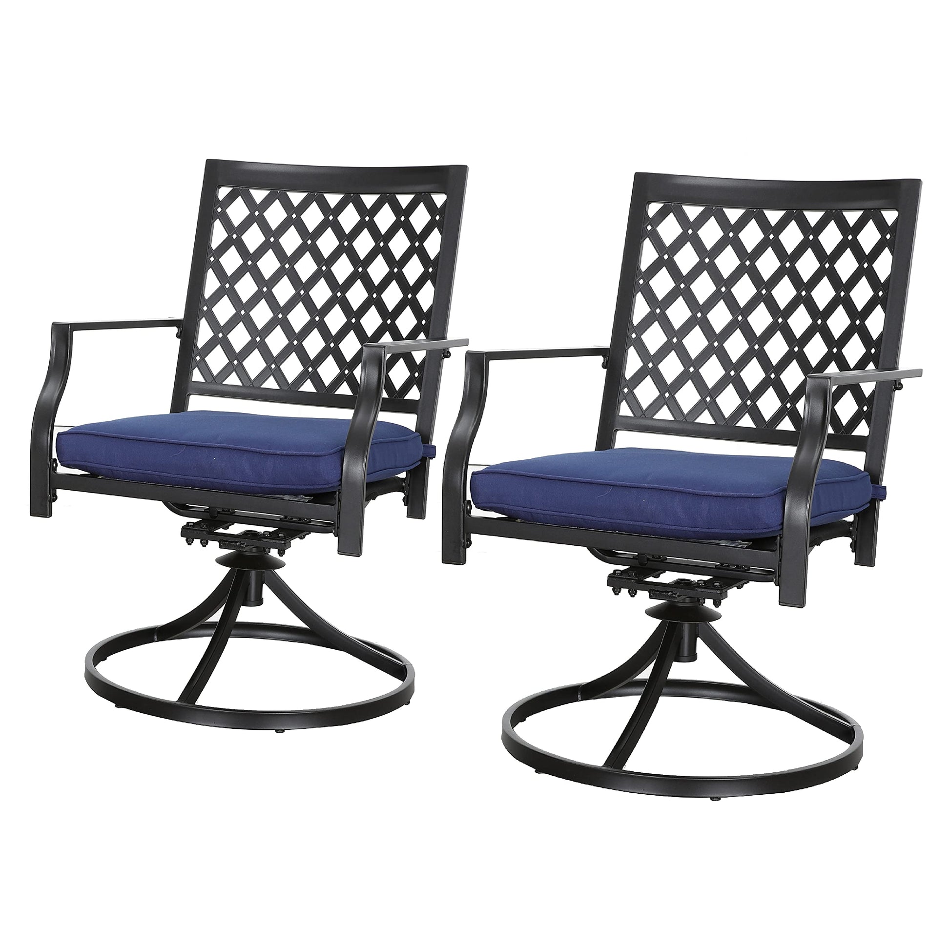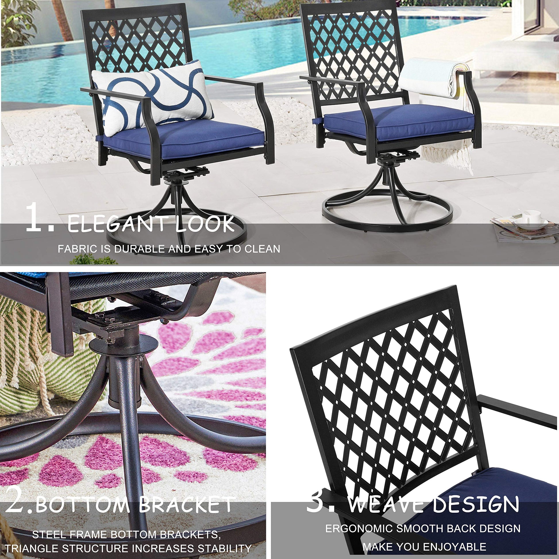 - STURDY CONSTRUCTION Metal iron frame with rust-resistant e-coating which makes patio dining chairs all weatherproof and lasts for many years outdoors. Super comfortable and soft springy sponge cushion provides added comfort to the swivel rocker chair.