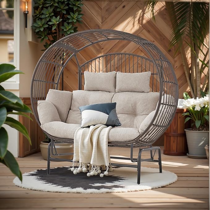 - Sturdy Material: The double egg chair's main frame is made of steel, supporting up to 450 lbs, while the exterior is outlined with PE rattan. Paired with thick seat cushions and headrest pillow, lying inside feels like being in a cozy nest, offering both comfort and a sense of security