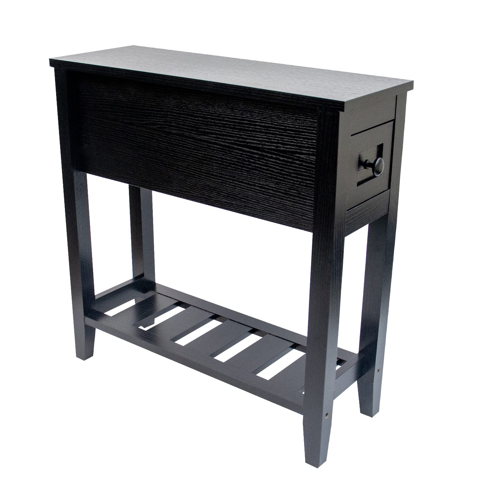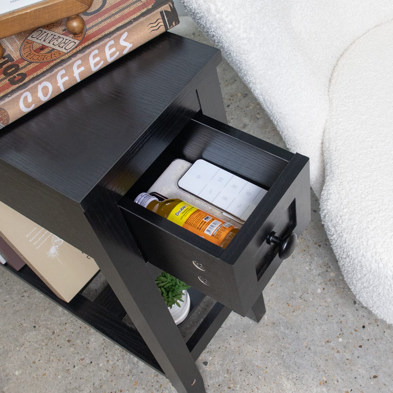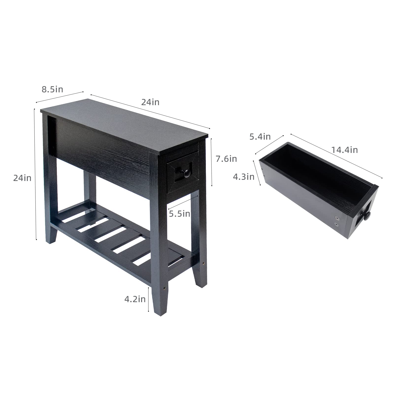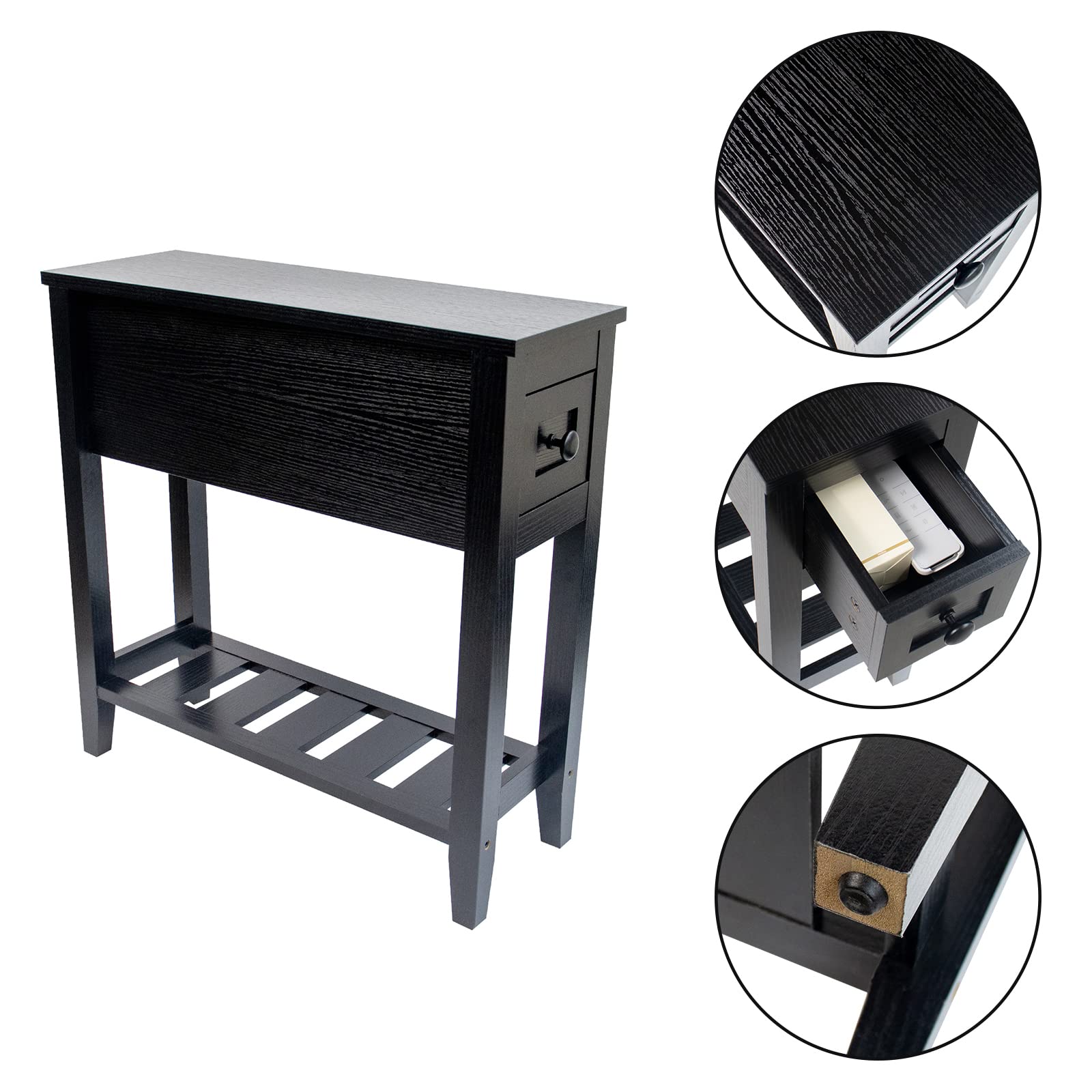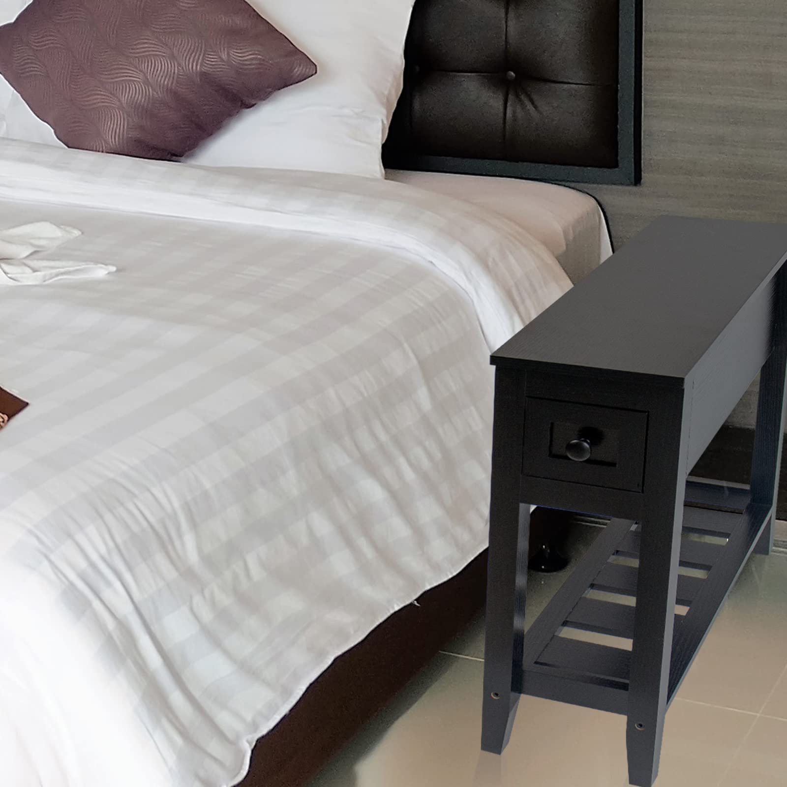- A black chairside narrow end table is the best table for the living room as a coffee table, bedroom nightstand, or sofa side table for you to put your mobile phone, charger, books, or other small stuff.