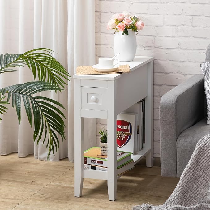 - Storage & Space Saving - This narrow nightstand is equipped with a storage drawer for you to put your mobile phone charger, remote control, or small jewelry. The shelf at the bottom also adds storage space to display some commonly used items such as books.